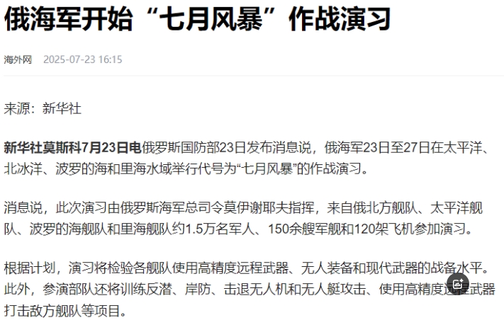 立陶宛总统瑙塞达已经瑟瑟发抖。据报道,7月23日,俄罗斯在无任何预告的情况下,发起了横跨太平洋、北冰洋、波罗的海、里海的大规模实战演习,飞机就出动120架。 这场突如其来的军事行动,恰似一记重锤砸在立陶宛的神经末梢,让这个波罗的海小国再次成为地缘政治博弈的焦点。 此次演习的规模堪称近年罕见。俄罗斯海军总司令莫伊谢耶夫亲自坐镇指挥,北方舰队、太平洋舰队等四大舰队精锐尽出,1.5万名军人参与的演练科目涵盖反潜作战、岸防反击、无人装备协同等实战化内容。 尤其在波罗的海区域,俄军舰艇频繁抵近立陶宛领海基线,其搭载的“口径”巡航导弹射程足以覆盖维尔纽斯全城。 这种极具压迫感的军事存在,与7月10日俄制Geran-2无人机穿越立陶宛领空事件形成鲜明呼应——那次事件曾导致立陶宛启动最高级别防空警报,总统瑙塞达一度进入地下掩体避险。 俄罗斯的军事动作背后,是对立陶宛近年激进外交政策的强烈反制。这个人口不足300万的国家,近年来甘当北约东扩的“马前卒”:不仅高调支持乌克兰,还在加里宁格勒过境运输问题上制造障碍,甚至允许台湾地区设立所谓“代表处”,导致对华关系严重恶化。 而中国实施的精准制裁已使立陶宛对华出口暴跌95%,木材加工等支柱产业濒临崩溃,而台湾承诺的2亿美元投资实际到位不足15%,经济困境与外交孤立形成恶性循环。 在这种背景下,俄罗斯通过军事演习传递的信号不言而喻:挑战其核心利益的行为,都将面临雷霆般的回应。 对于立陶宛而言,更严峻的挑战在于北约集体防御机制的脆弱性。尽管立陶宛自2004年加入北约后,在境内部署了多国组成的“增强型前沿存在”部队,但面对俄罗斯的核威慑,这些常规力量显得杯水车薪。 俄罗斯在加里宁格勒部署的“伊斯坎德尔”导弹系统,可携带战术核弹头对北约成员国实施“先发制人”打击,而北约至今未就核武器使用达成统一应对方案。 正如俄军事专家科诺瓦洛夫所言,俄罗斯的演习本质上是在测试北约的战略决心——当立陶宛真正遭遇“失控核弹”威胁时,北约是否愿意以自身安全为代价履行盟约,仍是一个巨大的问号。 在这场大国博弈中,立陶宛的处境愈发艰难。其境内的苏瓦乌基走廊是连接波兰与波罗的海三国的唯一陆上通道,一旦被俄罗斯切断,北约东翼将陷入孤立。而此次“七月风暴”演习中,俄海军重点演练的海上拦截与反潜作战,正是针对北约可能的海上补给线。 面对此情此景,立陶宛民众的恐慌情绪持续蔓延,首都超市的应急物资销量激增,社交媒体上“下一个乌克兰”的担忧声浪此起彼伏。 这场横跨四大洋的军事演习,犹如一面棱镜,折射出后冷战时代地缘政治的残酷现实。立陶宛或许只是棋盘上的一枚棋子,但它的命运却足以牵动整个欧洲的神经。