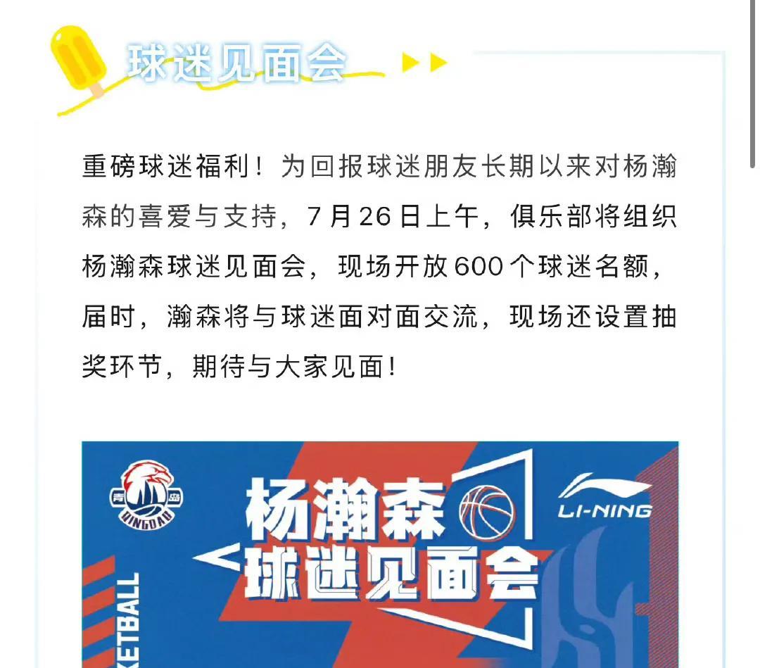 NBA球星见面会~杨瀚森![奸笑] 据报道,杨瀚森即将回国但是暂时不参加中国男篮和其他球队的热身赛! 26号上午,杨瀚森还有个球迷见面会,600位球迷参加,这待遇,真是巨星归来! 周琦还在美国康复,过几天回国,能否出战热身赛还未知! 另外今晚7点30分有中国男篮和委内瑞拉男篮的热身赛可看!