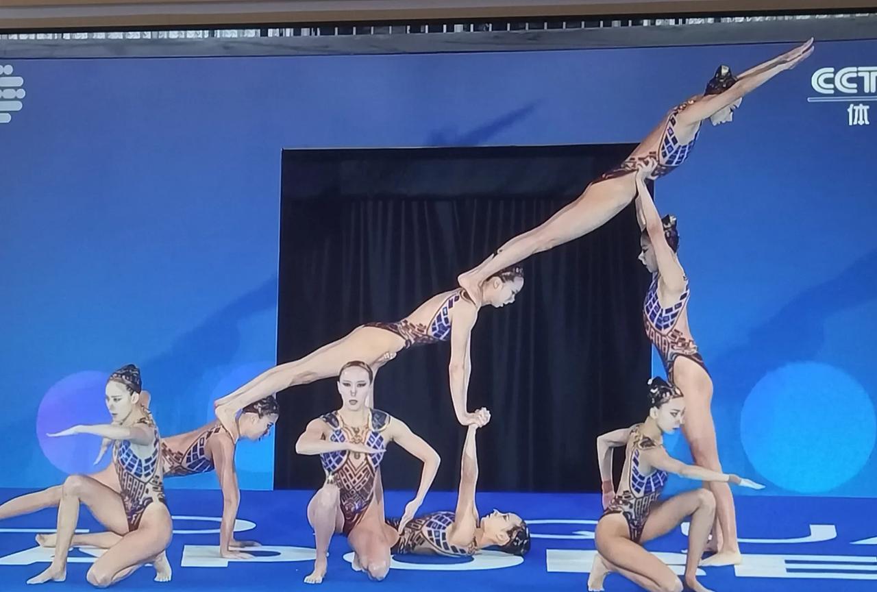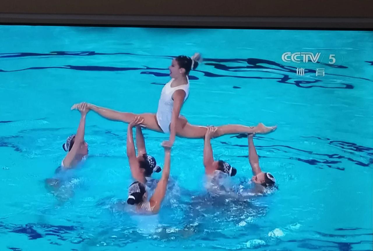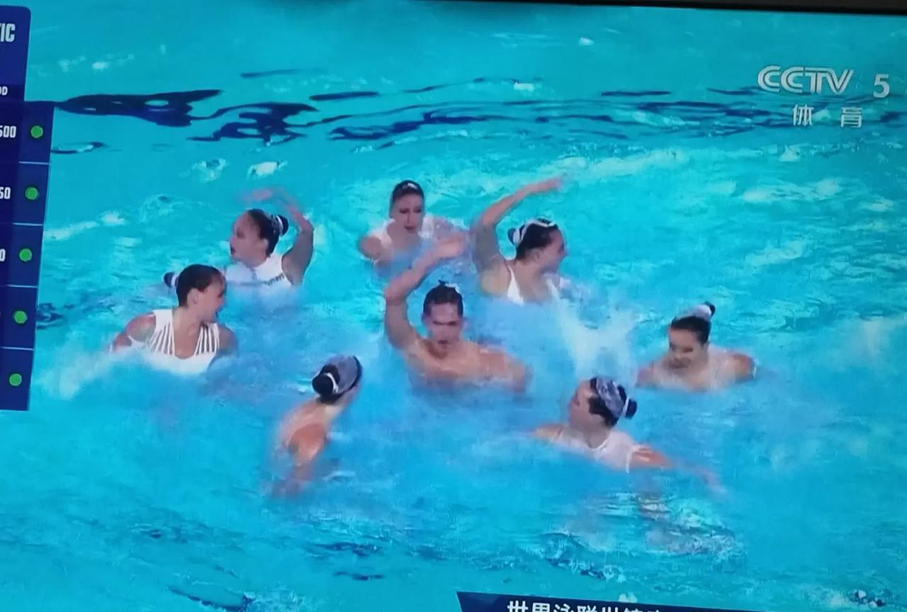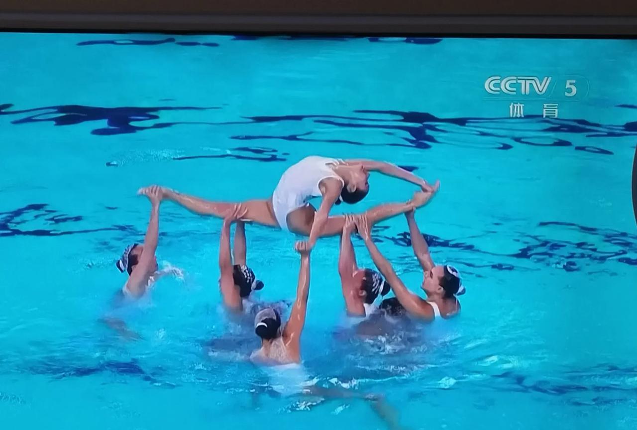 花样游泳女的里面出来个男的。 昨天看了中国花游表演的孙悟空很惊艳。 今天是主题是