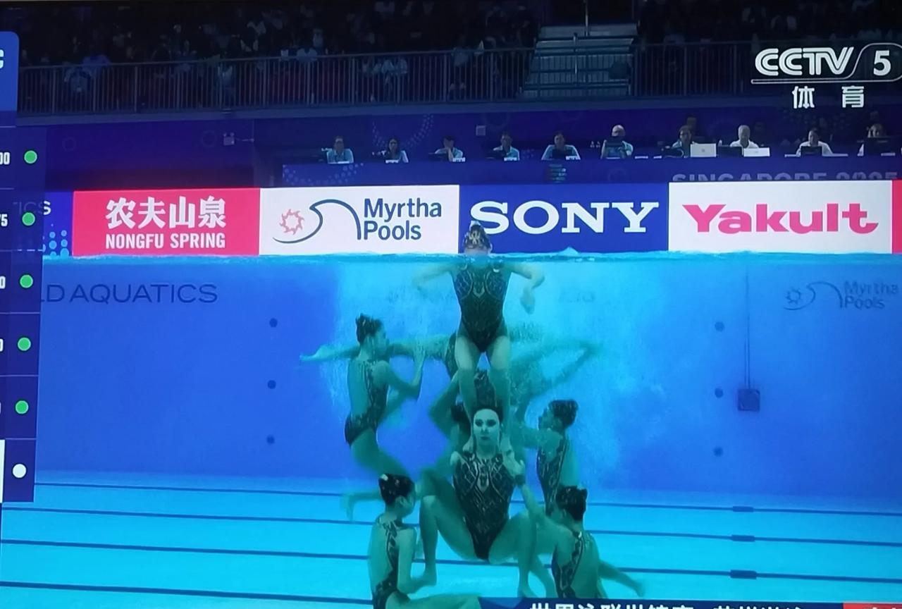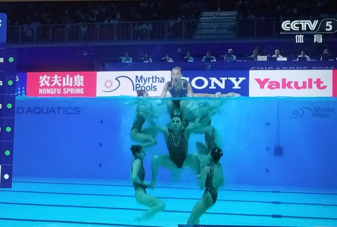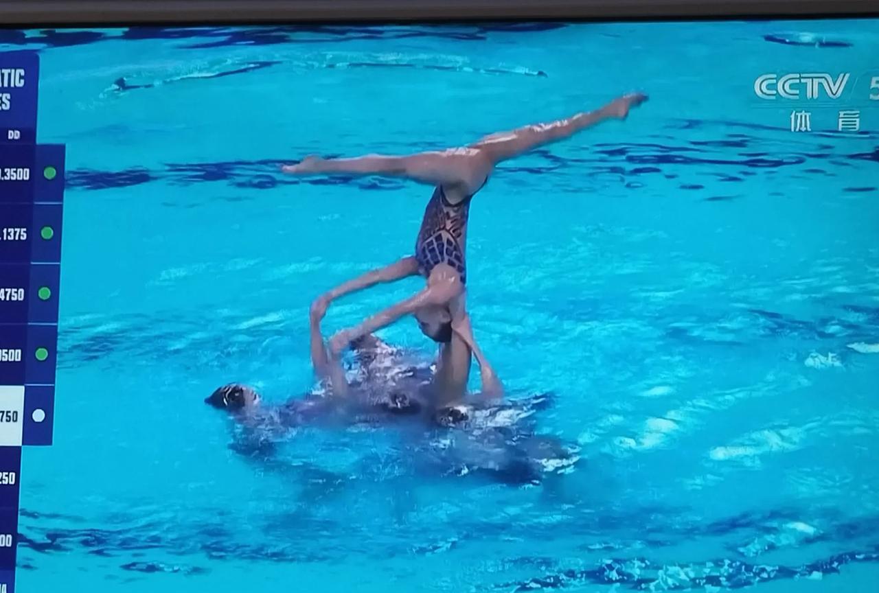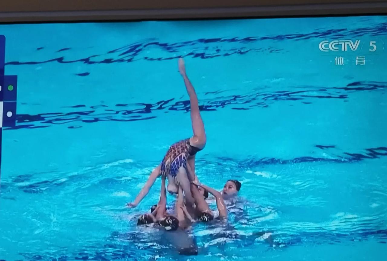 花样游泳女的里面出来个男的。 昨天看了中国花游表演的孙悟空很惊艳。 今天是主题是