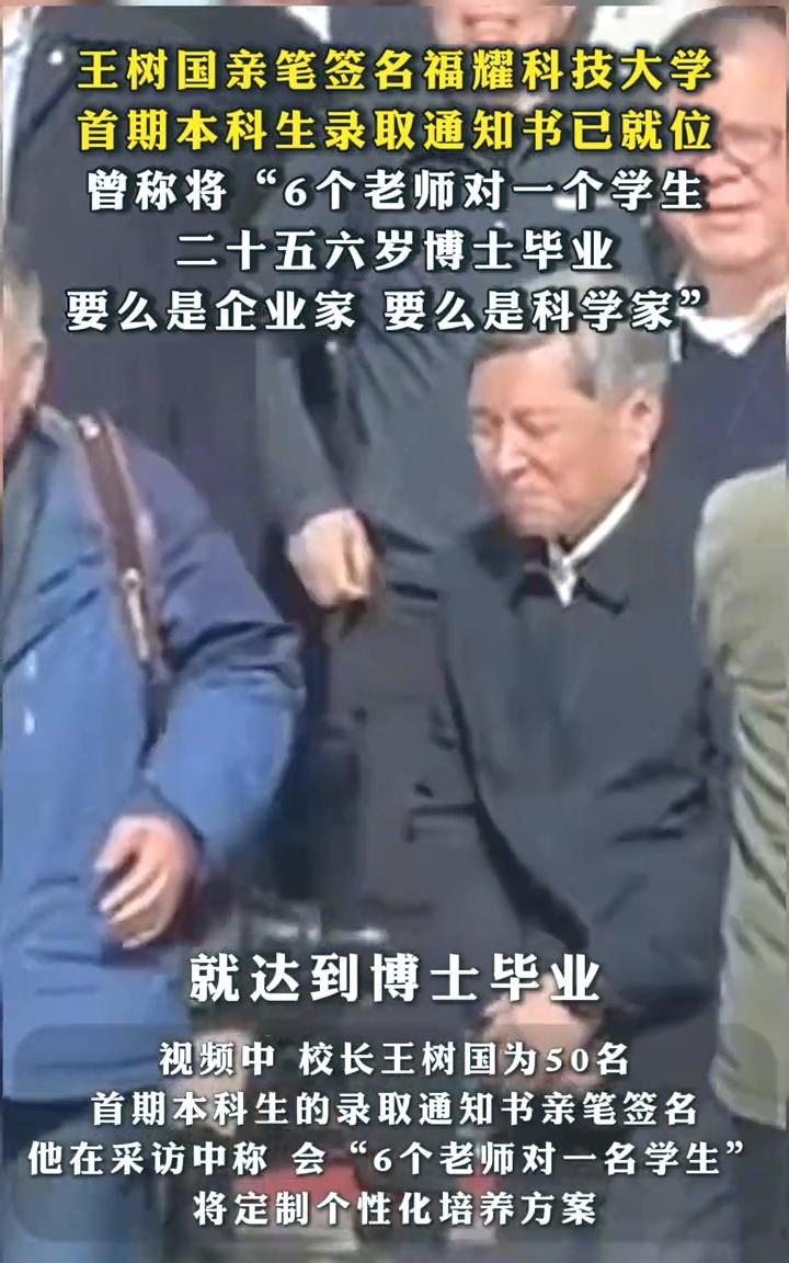 王树国亲笔签名福耀科技大学首期本科生录取通知书已就位,曾称将"6个老师对一个学生,二十五六岁博士毕业,要么是企业家要么是科学家"。 中新视频。 7月23日,"福耀科技大学"视频号发布消息称,福耀科技大学首期本科生专属编号FYUST20250001录取通知书已就位。 我们把本硕博贯通,让孩子们二十五六岁就达到博士毕业,要么你是企业家,要么你是科学家。 视频中校长王树国为50名首期本科生的录取通知书亲笔签名,他在采访中称会"6个老师对一名学生",将定制个性化培养方案。