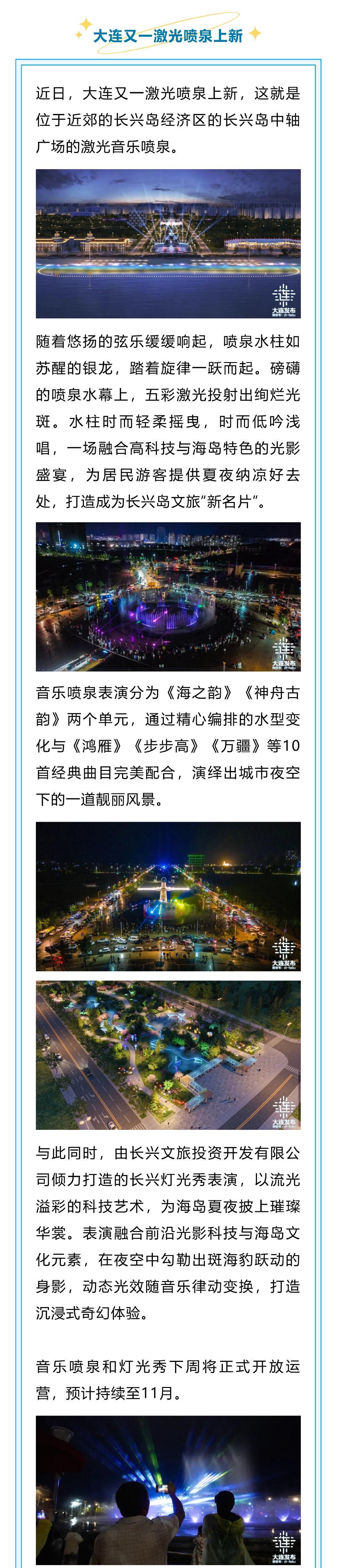 【大连又一激光喷泉上新】近日,大连又一激光喷泉上新,这就是位于近郊的长兴岛经济区的长兴岛中轴广场的激光音乐喷泉。与此同时,由长兴文旅投资开发有限公司倾力打造的长兴灯光秀表演,以流光溢彩的科技艺术为海岛夏夜披上璀璨华裳。音乐喷泉和灯光秀下周将正式开放运营,预计持续至11月。(大连发布 文字:吴耀辉 资料:长兴岛经济技术开发区党建综合服务中心 图片由受访单位提供)