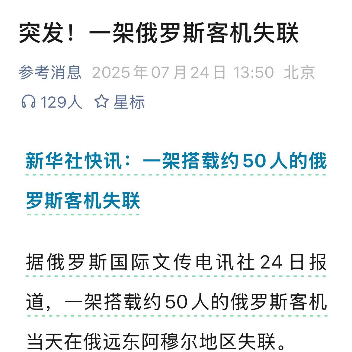 恐袭?俄罗斯一架客机突然坠毁! 当地时间24日,俄罗斯一架载有49人的安 - 24客机于俄远东地区失联,初步消息表明无人生还。 俄紧急情况部表示,搜救队伍已经发现燃烧着的机身。安 - 24的碎片在距离机场15公里处被发现。 据悉,机上有43名乘客(其中包含5名儿童)以及6名机组成员,执飞哈巴罗夫斯克 - 布拉戈维申斯克 - 滕达航线。 据俄罗斯联邦侦查委员会消息,这架客机在阿穆尔州滕达机场首次降落失败后复飞,第二次尝试降落时失联。俄罗斯联邦侦查委员会已立案进行刑事调查。 是否涉及恐袭,目前尚不得而知。