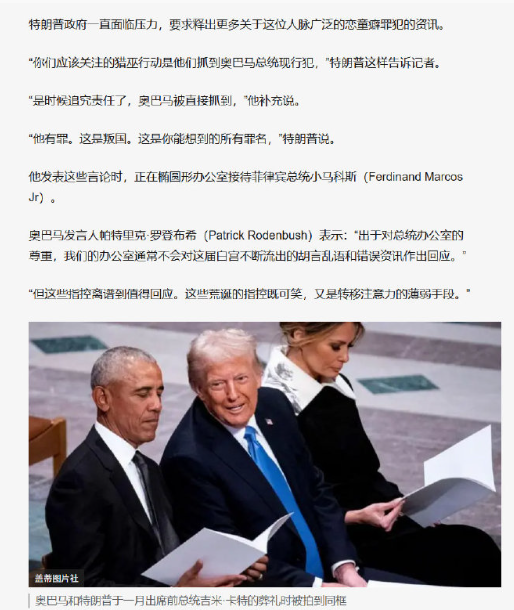 🔻外媒:特朗普指控奥巴马犯下“叛国罪”。 🔻奥巴马办公室发言人罕见回应,称特朗普的攻击是“一种薄弱的转移注意力手段”。