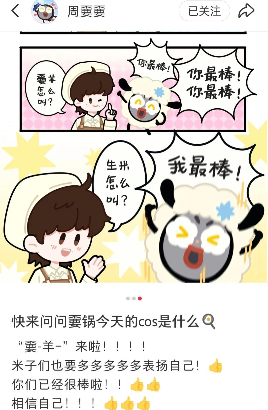 我们最可爱的周嫑嫑更新了! 嫑羊=表扬,周深果然最爱谐音梗,变着法子让米子们开心,这小漫画看得我又想笑又想哭的! 嫑羊会上线吗?好萌啊!深米都值得嫑羊! 看了一下西安的天气,39度!这气温有点高啊! 大家注意防暑降温,周深演唱会的座位上给大家准备了降温套装,自己也可以备点藿香正气水什么的,有备无患嘛! #周深#
