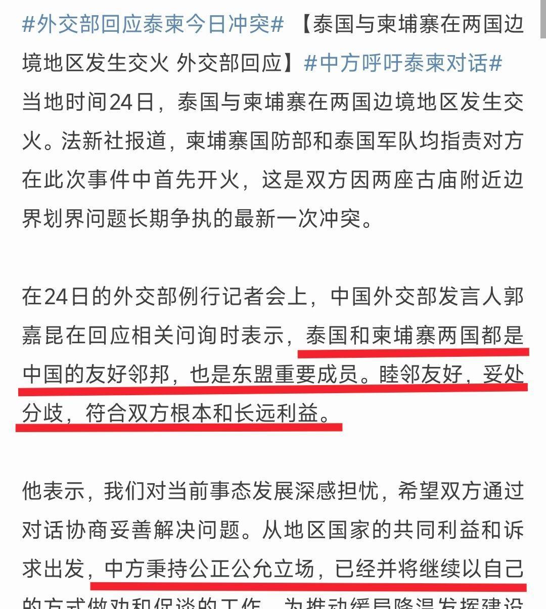 外交部回应泰柬冲突,中方已在行动 24日,泰国和柬埔寨突然爆发的武装冲突牵动了全
