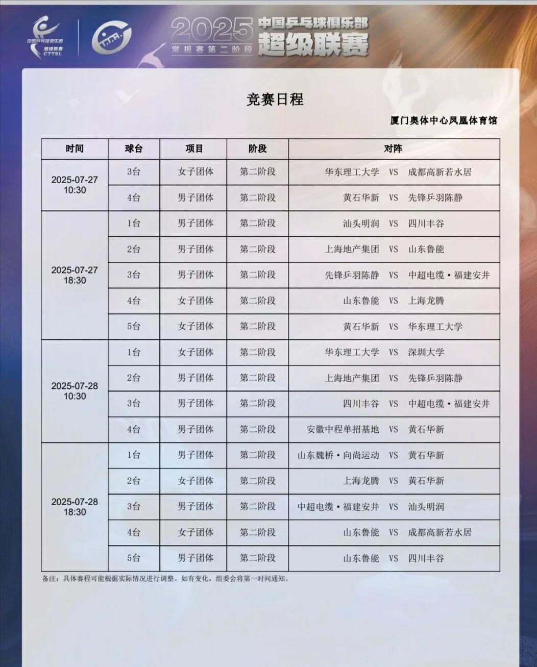 厦门站,乒超联赛第二阶段对阵表,可以看到球台桌次安排,各位乒乓健儿已经是磨刀霍霍