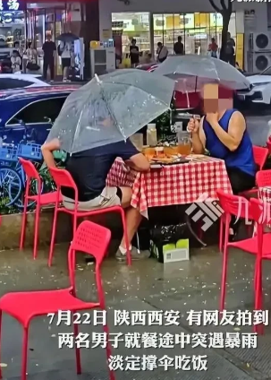 7月22日,陕西西安,两名中年男士在路边吃烧烤,大约半个小时后,下起了暴雨。老板急忙走过来,打算收拾酒菜到屋里吃,没想到两位大哥不乐意了,说这样挺惬意,特别轻松。