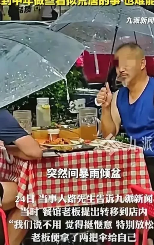 老板听了摇了摇头,找来两把雨伞给他们。两名男士打开伞边聊边喝,雨水击打着伞面,像弹奏一曲激荡的钢琴曲,把哥俩兴奋的,就差高歌一曲了。