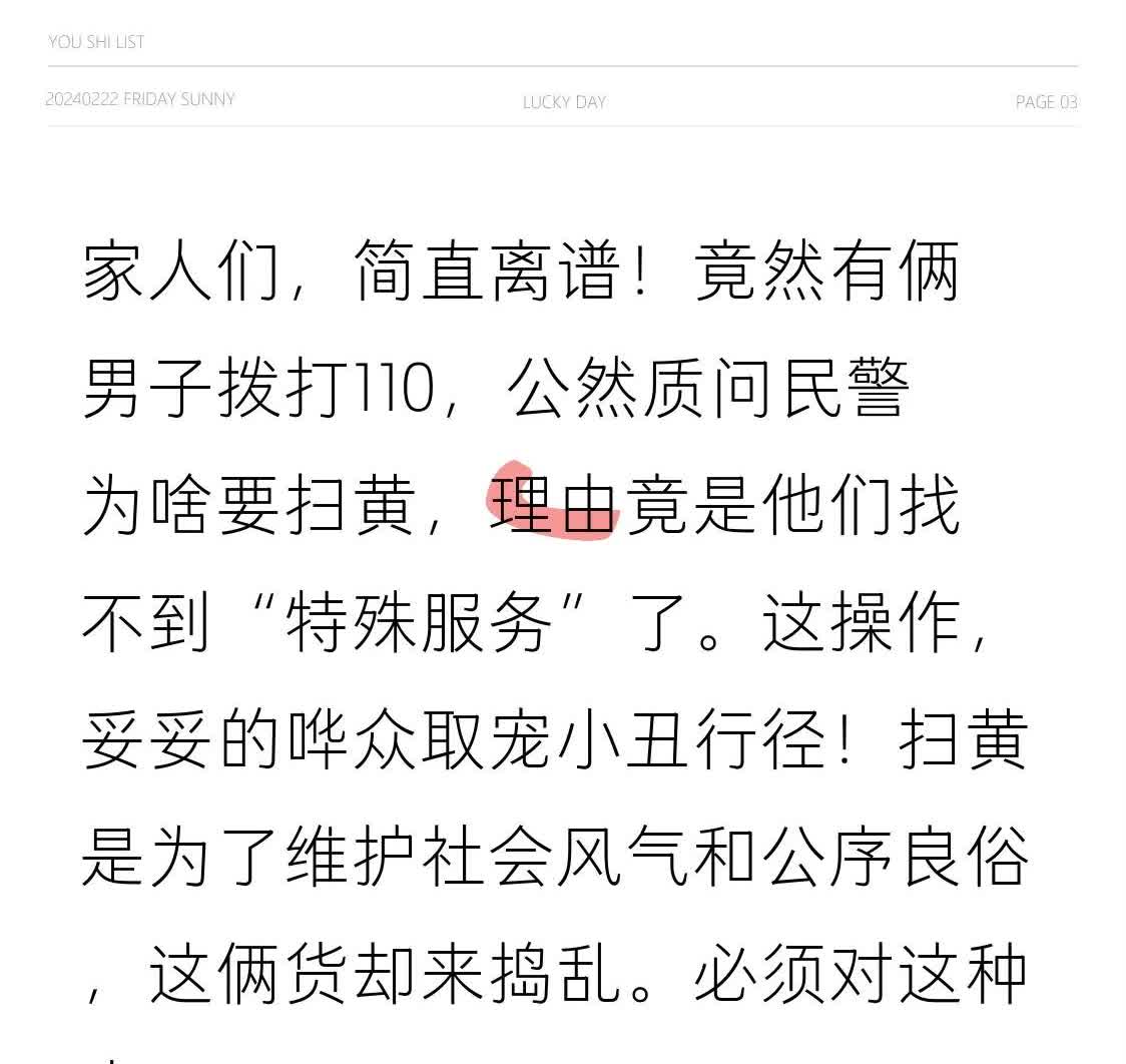 家人们,简直离谱!竟然有俩男子拨打110,公然质问民警为啥要扫黄,理由竟是他们找不到“特殊服务”了。这操作,妥妥的哗众取宠小丑行径!扫黄是为了维护社会风气和公序良俗,这俩货却来捣乱。必须对这种小丑行径严打,绝不能姑息!
