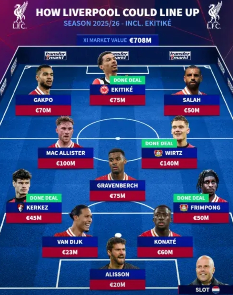 下赛季利物浦的预计首发阵容将是锋线加克波、埃基蒂克、萨拉赫,中场三人组麦卡利斯特、维尔茨、赫拉芬贝赫,后卫线凯尔凯兹、范戴克、科纳特、弗林蓬,门将阿利松!这个阵容看上去无论在英超还是欧冠赛场都具备争冠的实力,你认为新赛季利物浦会取得怎样的成绩呢?