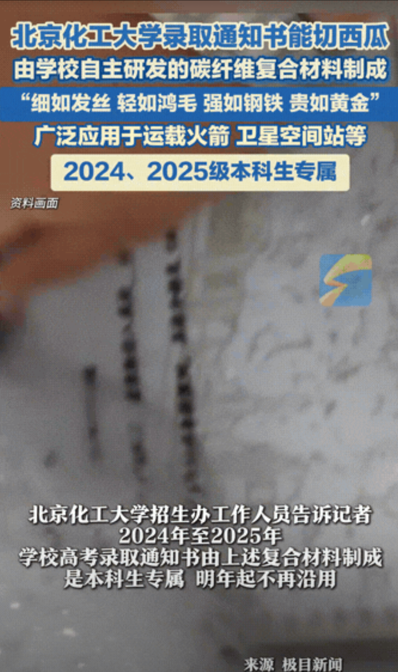 “太硬核了!”河北,一位新生竟然用北京化工大学的录取通知书切开了西瓜!更神的是,这张“纸片刀”事后完好无损。原来,这仅仅有0.2mm的通知书,居然是学校用造火箭卫星的同款碳纤维做的“黑科技”!而且还专属于2024和2025级本科生,明年就将成为绝版!网友:“航天材料秒变入学凭证,这波操作,可真够硬的!” 据闪电新闻7月23日报道:一张录取通知书,蘸点水,竟然把西瓜切开了!而且事后拿起来一看,通知书本身一点事儿没有。这事儿听着像段子,可它真真切切发生了! 最近,河北廊坊一位家长拍下了女儿用北京化工大学的录取通知书切西瓜的视频,看得人一愣一愣的。 这可不是什么普通纸片子,北京化工大学招生办说了,这份特别的录取通知书,是给2024年和2025年这两年入学的本科新生准备的。 它用的材料,是学校自己材料学院搞出来的宝贝,一种新型的碳纤维复合材料。这东西薄得很,只有0.2毫米,比头发丝还细得多,拿在手里轻飘飘的,但那结实程度,据说能跟钢铁比肩,价钱也不便宜。 平时,这种材料都是用在运载火箭、卫星、空间站这些高大上的航天航空领域,是真正的“高精尖”玩意儿。 学校把它做成录取通知书,也算是让咱老百姓亲手摸一摸“天上的材料”了。 视频传开,网上议论可热闹了。不少人觉得这创意真棒,“硬核通知书”成了热门词。 有网友说:“孩子拿到这么一份通知书,又新奇又有面子,还没进校门就感受到学校的科技实力了,这开学礼真有意义!” 当然,也有不同的声音冒出来:“录取通知书搞这么结实,还能切西瓜,是不是有点“力气用错了地方”?它的本质不就是一张通知入学的凭证吗?” 学校方面回应得很明确:这种碳纤维复合材料做的通知书,是2024和2025级本科生的“专属福利”,到了2026年,就不用了。 一张薄薄的纸,因为用了航天级的材料,能切开西瓜,也切开了大家的讨论,它确实展示了科技的神奇和学校在材料领域的实力,给新生带来了特别的惊喜和自豪感。 关于这份通知书,您看了觉得是惊喜多一点,还是觉得心思应该花在别处?欢迎大伙儿聊聊。