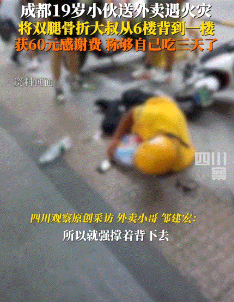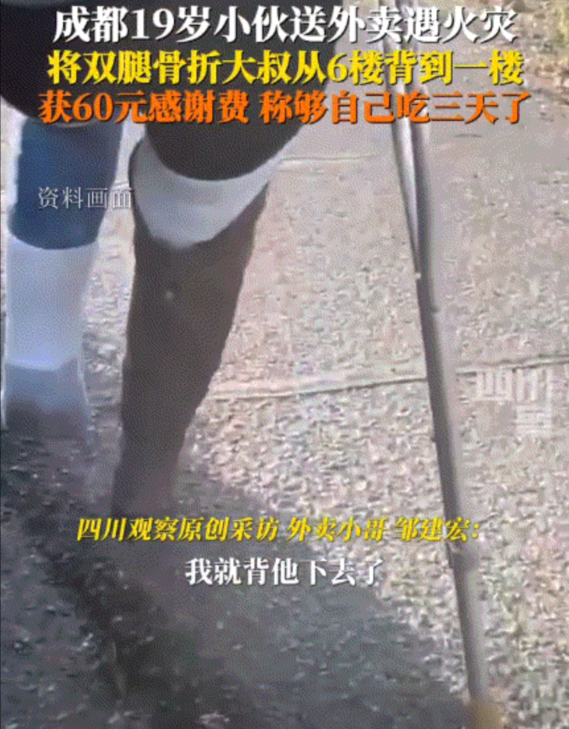 四川成都,一19岁小伙去医院送外卖,结果上到6楼时才知道医院里发生了火灾,于是小伙将外卖送到了一个双腿骨折的大叔手中后,这大叔则希望小伙帮帮忙,把他从6楼背下去。虽然小伙看到这位大叔不但比他高,还比他魁梧,但情况危急,小伙也顾不得那么多,赶紧背上大叔就往楼下赶。