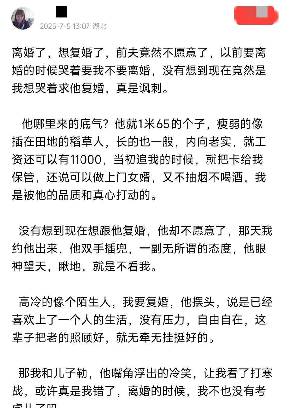 两级反转!女子离婚时有多嚣张,想复婚时就有多卑微。 女子跟老公过不下去了,态度强硬,不考虑儿子,非要离婚,老公哭着求着不要离婚都阻碍不了女子的决心。 没想到现在女子想复婚,好说歹说前夫就是不愿意。 可以同居但不领证,为了孩子完整,以后不合适立刻分开互不相欠,经济独立自主 男人轻易不会提离婚,当他同意离婚了,再回头复婚的概率是极低的。因为他的心彻底凉了。 男人离婚了,婚姻不能使男人快乐,,就不会再结婚了,已经体验过了,全是被压榨,家庭没有一点值得男人留念。