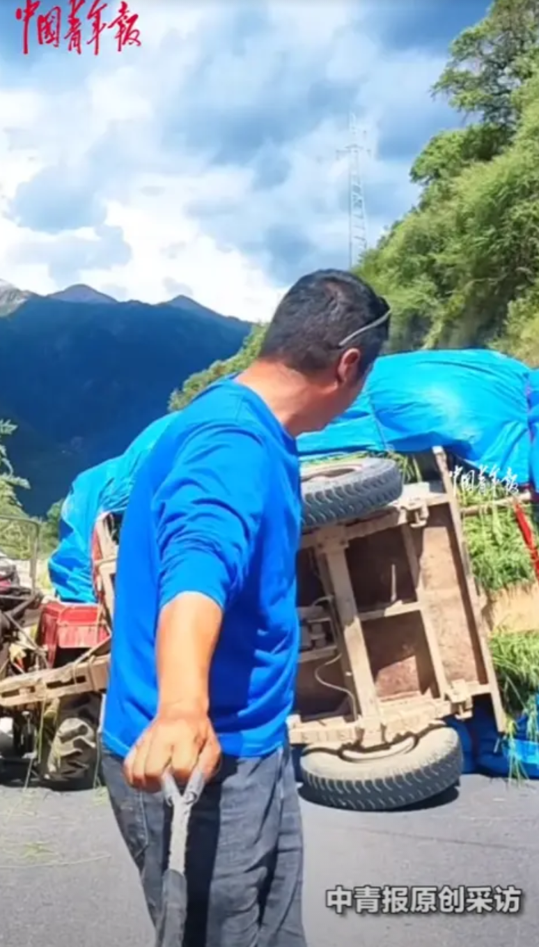 司机一慌打了把方向盘,结果连人带车直接翻了,幸好司机没受伤,可看着翻倒的拖拉机,急得直搓手,“别慌,我车上有绞盘!”师傅二话不说,从后备箱里拿出工具。
