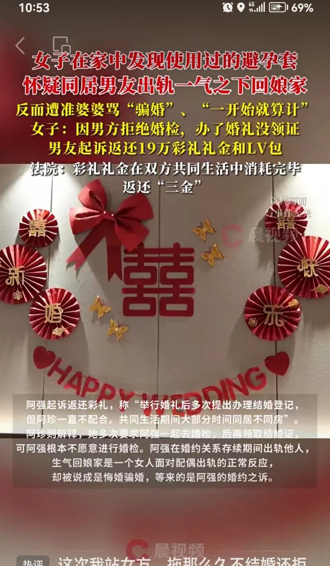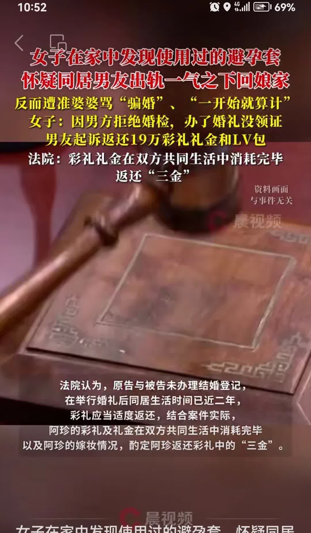 《发现“避孕套”,女子疑男友出轨回娘家,法院这样判了…》 阿珍和阿强举办了婚礼同居近两年,阿珍在家发现用过的避孕套,怀疑男友出轨回了娘家,结果被准婆婆认为是“骗婚”,一纸诉状将阿珍告到了法院。 恋爱期间,阿强给了19万彩礼、三金,还有LV包,现在要求返还。阿珍则认为前期多次要求婚检,阿强却不愿意。阿强则指责阿珍大部分时间同居不同房,疑起初就是奔着“骗婚”来的。 法院最后判决认定二人同居期间彩礼及LV已消耗用尽,仅判决阿珍返还“三金”费用。 这个事件其实挺让人无语的,二人举行婚礼并同居二年但却没有领证,没有得到法律认可,但感情基础不牢固,互相猜忌,以致最后劳燕纷飞,诉诸公堂,实在让人唏嘘。 仅凭一个子虚乌有的避孕套就怀疑男友出轨,但同居期间很少同房,女子的行为让人费解。 屏幕前的友友,你对这起“婚姻闹剧”怎么看?下方一起聊聊