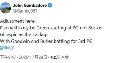 根据不靠谱的记者John Gambadoro最新消息透露,太阳计划让杰伦-格林担任下赛季的首发控卫,而不是德文-布克,布克将继续承担得分后卫的角色!