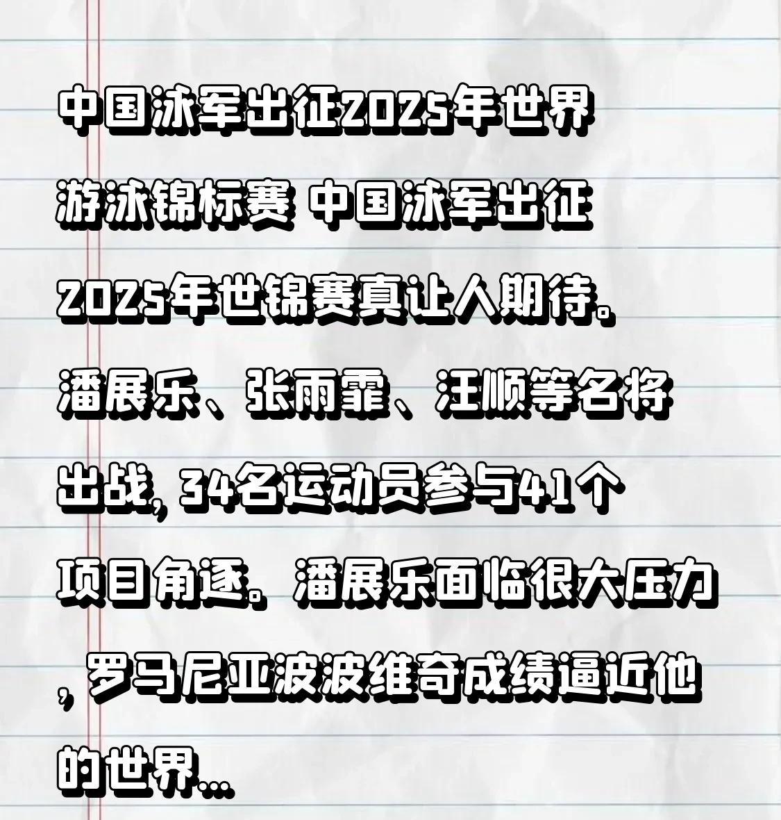 中国泳军出征2025年世界游泳锦标赛 中国泳军即将出征2025年的世界游泳锦标赛啦,这可真叫人满心期待呢。 潘展乐、张雨霏、汪顺等一众名将都将出战此次世锦赛,总共34名运动员会参与到41个项目的激烈角逐之中。潘展乐身上的压力可不小啊,罗马尼亚的波波维奇的成绩已经快要逼近他所保持的世界纪录了。不过潘展乐也说了,他会全力以赴做到最好的。汪顺呢,这已经是他第八次征战世锦赛了,虽然他对输赢看得比较淡了,可是那股好胜之心依然还在。2024年多哈世锦赛的时候,中国队在接力项目上取得了不错的成绩,而且在巴黎奥运会上还夺得了男子4×100米混合泳接力的冠军,这次世锦赛,接力项目依旧是重点项目呢。不管从哪个方面来看,中国队都是具备夺金实力的。真希望他们能在新加坡的泳池里大显身手,打破更多的纪录,再次为中国游泳事业增添光彩。 #运动员张雨霏# #中国泳队# #全国泳锦标赛# #全泳式自由泳# #中国泳将挑战#