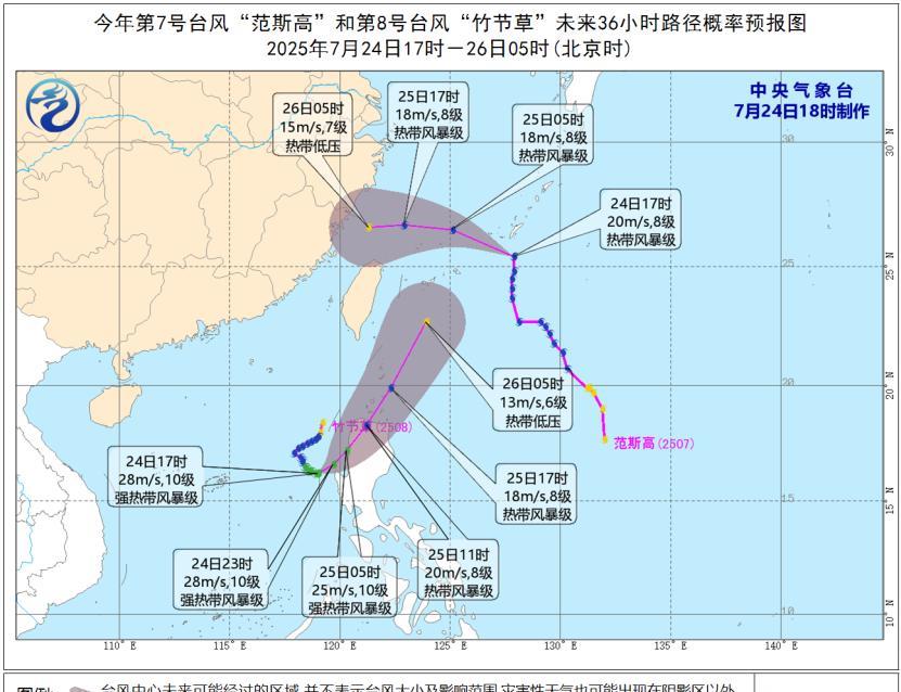 台风“竹节草”增强至11级,即将在菲律宾吕宋岛登陆!据中央气象台预报显示,24日23时50分,台风“竹节草”最大风力提升至11级(30米/秒),位于菲律宾马尼拉西北方向约210公里的海面上;目前,“竹节草”将以每小时35~40公里的速度向东北方向快速移动,强度逐渐减弱。预计25日凌晨至上午,“竹节草”将在吕宋岛西北部沿海登陆,登陆强度可能有10级;横扫菲律宾后,“竹节草”将进入巴士海峡并趋向台湾以东洋面,强度逐渐减弱。目前来看,“竹节草”撞上吕宋岛高山后,出海只剩下一口气,未来对我国沿海陆地影响不大。 由于7号台风“范斯高”与“竹节草”的距离不算很远,可能会出现“双台风效应”,这两个台风就会相互撕扯,导致双方强度都偏弱;不过,“竹节草”从菲律宾境内出海后,后期路径还是要留意一下,可能会给我国东南沿海带来明显降雨。另一个台风“罗莎”的路径指向日本方向,巅峰强度可能有11~12级,登陆日本的概率不大;但它有一个好处就是切断太平洋高压西伸的通道,预计未来一段时间(7月底至8月初),不会有台风向西移动影响或登陆我国。