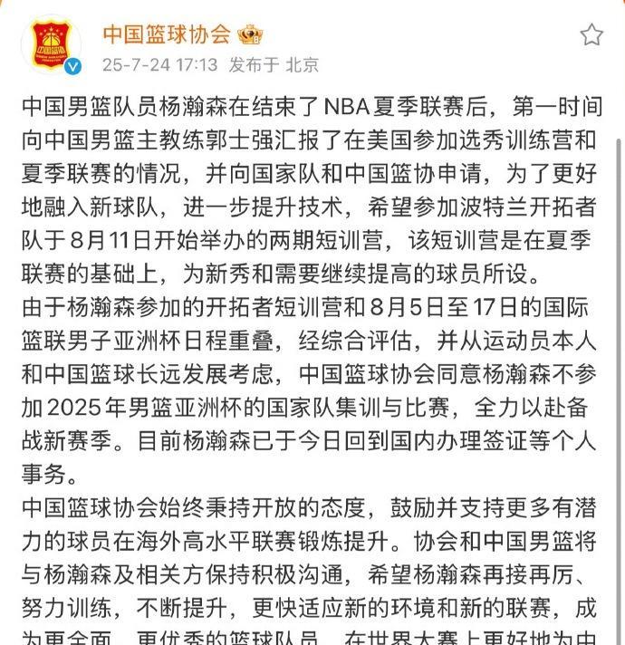 中国篮协变聪明了,不再和舆论对着干了,同意杨翰森留在开拓者练级,不用杨翰森参加亚