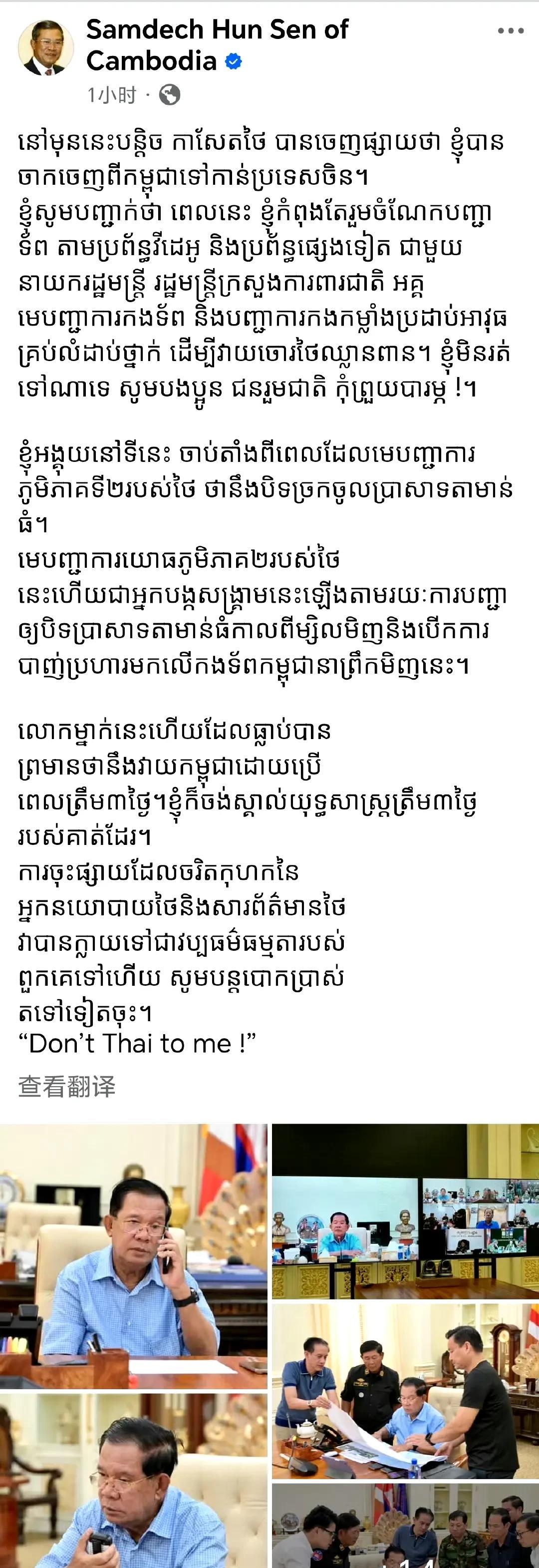 有人说洪森坐飞机跑去中国了,洪森本人亲自辟谣,没有这回事,是泰国部分媒体的不实传闻,我根本不用离开柬埔寨。 泰柬边境冲突已经造成11人死亡了,如果两国真的打起来很难说谁输谁赢了,泰国装备比柬埔寨要好,但军队战斗力比不上柬埔寨,大家都知道对方弱点,应该打不起大仗,更何况两国都是中国最大的贸易伙伴,中国施压一下应该都能收得住,还是好好发展经济吧,东欧,中东已经够乱了,东南亚不能乱,世界经济本来就不景气了,战争够多了,再折腾只是苦了老百姓。