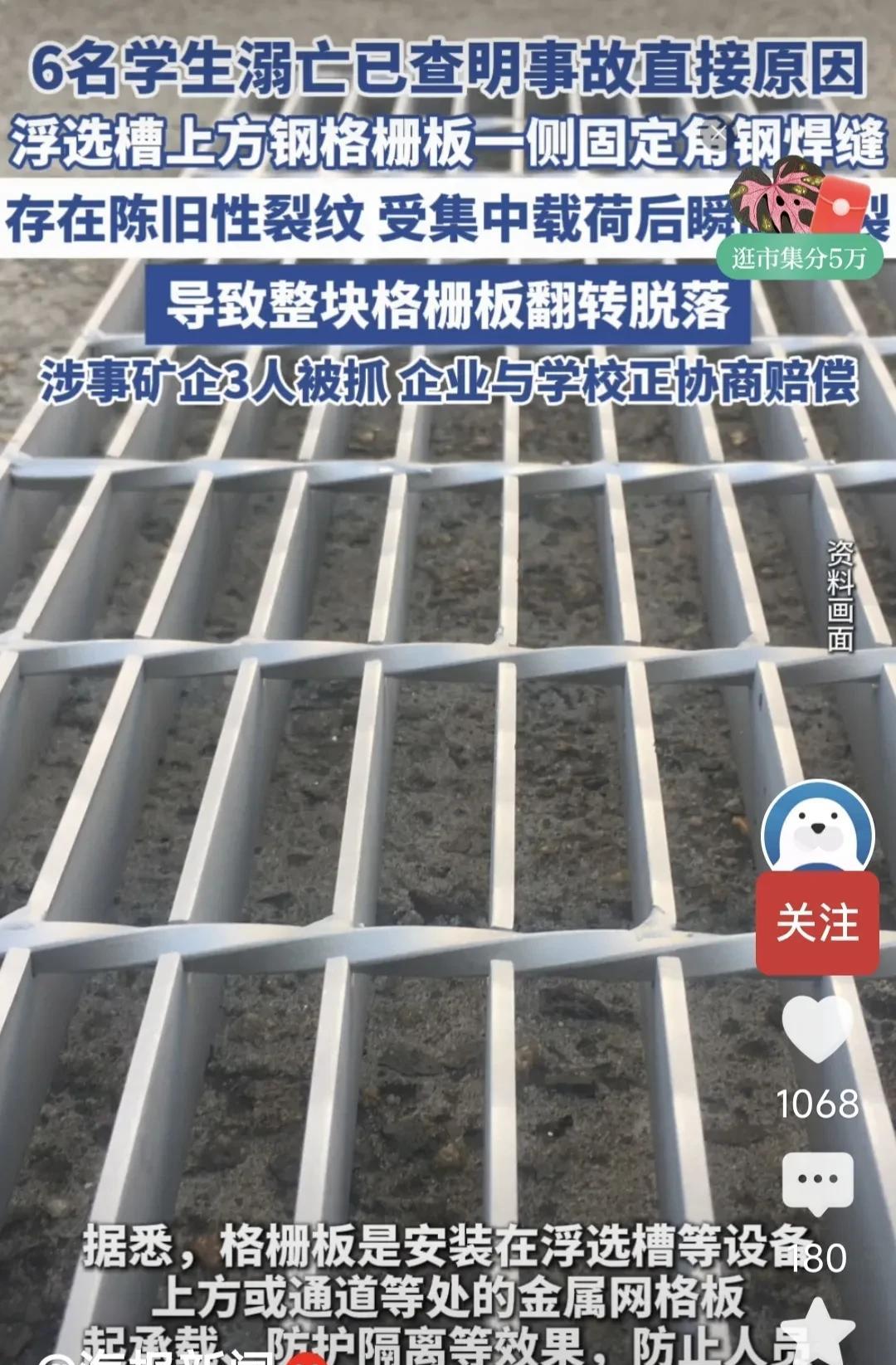 厂房内挂着红底白字的横幅,“安全重于泰山,防范始于未然”,安全管理的资料柜中各种安全检查表各种安全管理制度、应急预案非常齐全。 但就是搁置格栅板的钢托有陈旧裂缝了,却没人检查没人发现。就是这样一个致命疏漏,导致东北大学六名大学生瞬间失去生命。 东北大学6名大学生由老师带队到内蒙古某选矿厂参观学习,六人于浮选槽上方格栅板平台观摩浮选工艺时,格栅板整体脱落翻转,6名大学生从格栅板上掉进充满粘稠矿浆的浮选槽,导致六名大学生死亡,一名老师受伤。 安全管理不是口号,不是应付上级检查,不是把资料完善了就万事大吉了。口号满天飞,安全检查安全会议流于形式,这就是一些国内企业安全管理的现状,不出事是侥幸,出了事是必然。