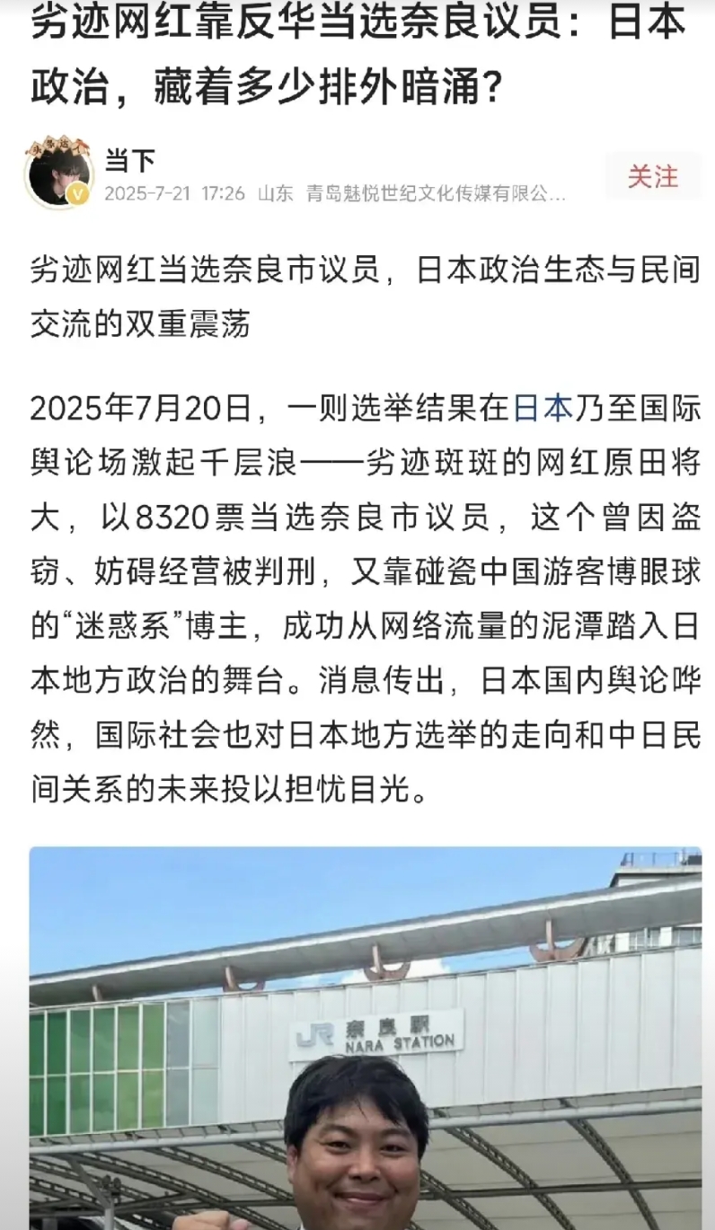 这两天日本丢人丢大了,带有盗窃前科、劣迹斑斑的无业游民原田将大,居然当选奈良市议员了,这可是当地人一票一票选出来的啊。 原田将大最出名的事迹,莫过于在奈良拍摄辱骂中国游客的视频,骂的那叫一个脏。尽管中国游客的动作不太恰当,但此人后来被人扒出来他就是没事整天在奈良转悠,专门找中国游客的茬来吸引流量。 实际上这暴露了一个现象,以我在日本生活工作的生活体验来说,现在二三十岁的人里,对外国人抱有敌意的人可能要占到一半以上,这也是原田这家伙能当选的原因。 因为现在日本的确存在很多问题,贫困问题,苛捐杂税众多,格差社会(贫富差距)等等,但是很多年轻人不从自己身上找原因,而是反过来怪罪于外国人来抢了他们的饭碗。 照这样下去,日本社会越封闭,前景越是堪忧。