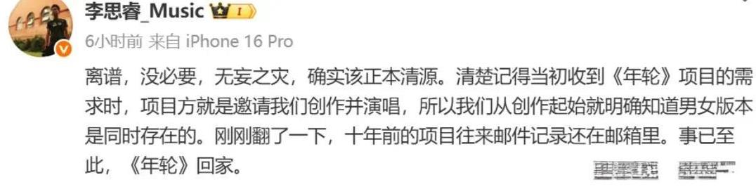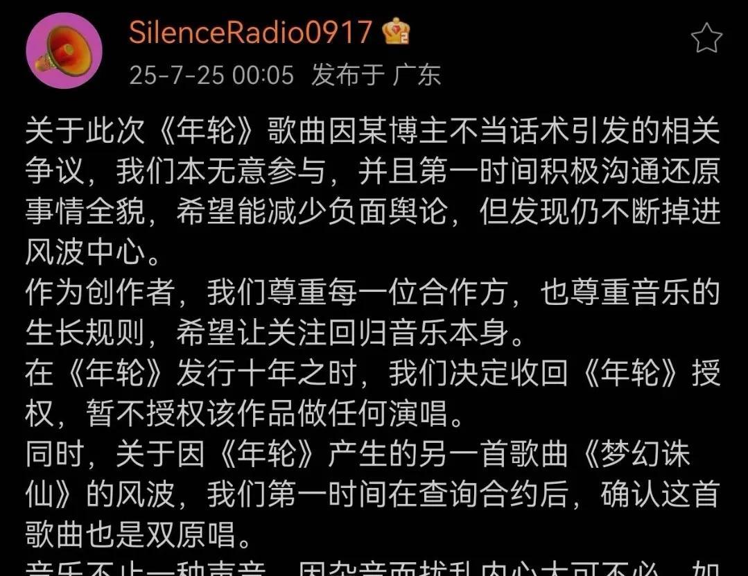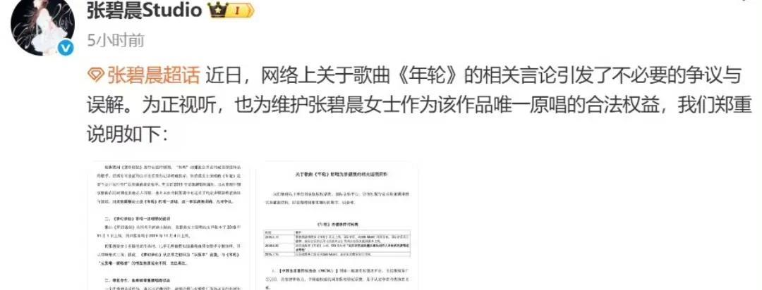 张碧晨这下玩大了,以后都不能唱《年轮》了,何必呢? 回顾一下《年轮》原唱之争的始末 事情从一个网红开始,追溯到2021年的评论,她说《年轮》的唯一原唱是张碧晨,此番言论经过发酵,引发粉丝之间的争议。 作为词曲作者,汪苏伦方发声明表示歌曲是双原唱,经过沟通仍旧无法阻止舆论发酵,所以决定收回歌曲版权,意味着张碧晨以后都不能再唱。 紧接着,张碧晨方不甘示弱,晒出很多所谓证据来证明自己是唯一原唱。 最后,汪苏泷经纪公司大象音乐总经理李思睿发文称,当初收到《年轮》项目需求时,项目方就是邀请他们创作并演唱,从创作起始就明确知道男女版本同时存在,十年前的项目往来邮件记录还在邮箱里。 我不太明白,张碧晨方面强调自己唯一原唱的意义是什么?难道谁唱火这首歌就是谁的吗?双原唱就丢人了?非要和汪苏伦方对撕,既不体面又很冷血。除了这首歌,还真不知道张碧晨有啥出名的原创作品。
