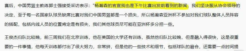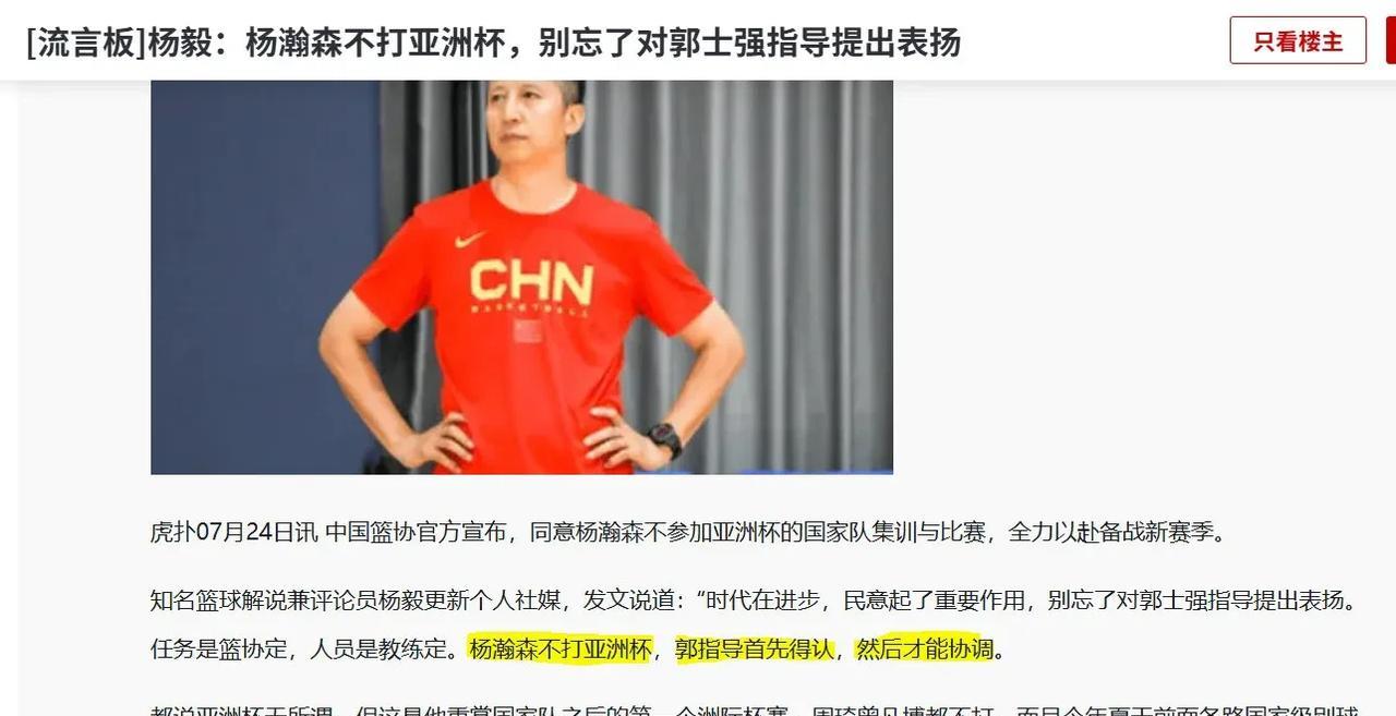 篮球名嘴杨毅发言失准:要表扬郭士强,让杨瀚森不打亚洲杯; 郭士强:杨瀚森不打?我