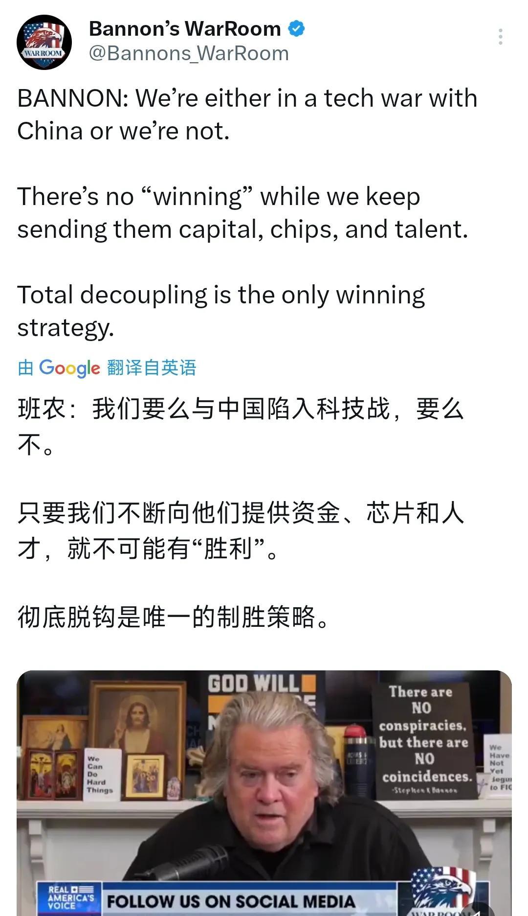 班农今天(北京时间7月25日)继续叫嚣道:“我们要么与中国陷入科技战,要么不。只要我们不断向他们提供资金、芯片和人才,就不可能有‘胜利’。彻底脱钩是唯一的制胜策略。” [机智]评几句:班农这番“彻底脱钩即制胜”的叫嚣,在美国还是很有市场。在经济全球化的今天,中美作为最大的两个国家经济体,早已你中有我、我中有你。不断提供资金、芯片等就“无法胜利”,这是把竞争简单粗暴化。脱钩断供,美国企业会失去庞大市场,科研也会失去交流碰撞的火花。他打着“胜利”旗号,实则是想让美国退回封闭小圈子。这种短视狭隘、逆潮流而动的言论,暴露其偏执做派。