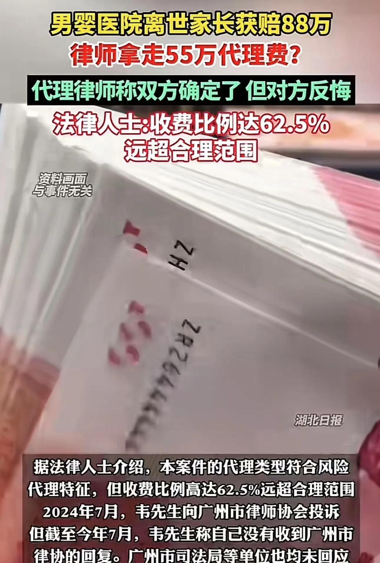 男婴在诊所离世,父母获赔88万,结果律师拿走55万代理费!父母:“我文化水平低,事后才意识到代理律师骗了我!代理律师:双方确定了,但对方反悔!法律人士:收费比例达62.5%,远超合理范围! 一对年轻父母的孩子当时不舒服,老韦夫妻俩带着去了家旁边的小诊所,谁想到吃了诊所给的药,孩子就没救回来。 老韦他们去找诊所讨说法,诊所压根不认账。两口子咬着牙走了两年多的法律程序,法院最后才判诊所赔两万块钱。 没过几天,他接了个电话,是位姓邓的律师主动找上门。 老韦起初心里打鼓,担心遇上骗钱的。但邓律师说话很有把握,还说可以官司打完再谈钱,这让他稍微放了心,想想孩子的事总得有个结果,就签了委托书。 后来的确打赢了官司,诊所被判赔八十八万。可到了拿钱的时候,邓律师拿出了份协议,张口就要拿走五十五万当代理费。 老韦当时就懵了,算下来拿到手的只剩下三十三万。他越想越不对劲,这钱是孩子命换来的赔偿金,一大半就这么进了律师的口袋。 老韦两口子没读过多少书,打官司那会儿根本就没留心收费这事的具体门道。直到银行信息发来,才看清楚被划走了五十五万。 他去年七月份找上了广州市律师协会投诉,可等啊等,快一年了也没个正式的回音。实在没辙,只好找媒体帮忙。 邓律师那边坚持认为收费是提前讲好的,怪老韦事后反悔。邓律师说,本来按医疗事故责任鉴定,诊所只该负次要责任,是他花了大功夫才把诊所的责任扳成了主要责任。他觉得老韦是看到钱赔多了就眼红,反过来咬一口,不地道。 这事在网上吵翻了天。有人骂邓律师心太黑,八十八万拿走五十五万,抽掉大半,比卖套房子抽的佣金还狠,简直是下刀子。 也有人说律师担着风险接活,官司打输了就一毛钱没有,打赢了多分点也说得过去,老韦拿到手的三十三万也比当初的两万强不少。 不过懂行的法律人站出来说话,通常这类人命关天的索赔案子,律师收费再高也不能超过赔偿金的三成。像这样收掉一大半,占了六成多,在哪儿都算离谱得没边了。 事情拖到了2025年七月,终于有了点动静。广州市律师协会发布了通告,证实去年八月确实接到了老韦的投诉,按规矩立了案。 调查过程中还挖出邓律师可能涉及其他违规问题。律协的人专门找到老韦,表示会帮忙协调退回多收的钱。 老韦松了口,愿意按国家关于风险代理的规定,支付赔偿款一成的代理费,也就是八十八万的百分之十八,大约十五万八。 邓律师之前多收的那部分,大概三十九万,律协答应帮老韦追讨。至于邓律师本身的违规行为,该怎么处罚还得按规定来。 记者后来一直想找邓律师问问律协通告的事,邓律师那边始终没接电话。他之前挂职的广东泰逢律师事务所,对此事一直保持沉默。 后来邓律师换到的广东元恩律师事务所,更是急着撇清,说这事儿是邓律师在之前的律所弄出来的,跟他们现在一点关系没有。 律协的人跟老韦也交了底,邓律师这个案子情况比较棘手,方方面面牵连比较多,需要更多时间调查。要是查出属于律协管不了的严重问题,可能还得移交给其他部门来处理。 这一连串的事情暴露了不少问题。普通老百姓摊上医疗事故,想讨个公道本身就难如登天。好不容易想找律师帮把手,又可能掉进收费不清不楚的坑里。 邓律师这种“风险代理”的模式,本意是体谅事主经济困难,可以先打官司后收费,可这好法子到了有些人手里,却成了趁火打劫的工具。 签合同的时候话说得比蜜甜,等官司赢了、赔偿到了,亮出来的账单能把人吓得倒抽冷气。那些文化水平不高、心思又都放在案子上的人,根本看不透合同里的弯弯绕绕,等吃了亏才发现已经晚了。 更要命的是,刚失去亲人的家属往往处于巨大的悲痛和混乱中,很难冷静地做出判断。老韦夫妻在孩子没了后,跟诊所纠缠两年只拿到区区两万。 突然跳出个律师打包票能把这事翻过来,他们就像抓住了最后的救命稻草。邓律师正是利用了他们这种急迫和绝望的心理,先是给出一线希望,然后在胜利时刻高举账单进行收割。 八十八万的赔偿金额,听起来数目不小,但扣掉五十五万的天价律师费,再想想那个永远回不来的孩子,这笔账,无论怎么算,都填不平他们心中的痛。 信息来源:《大河报》