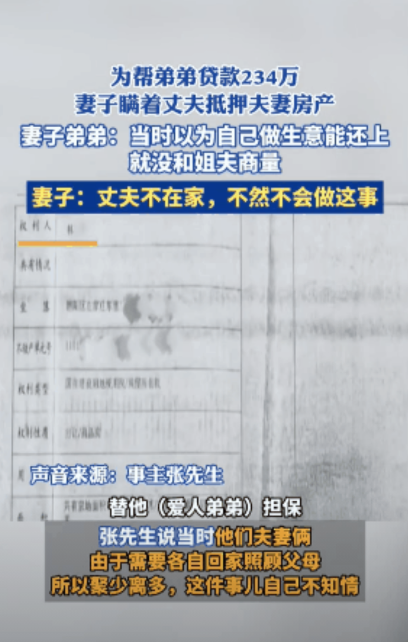 北京,一女子为帮自家弟弟渡过难关,趁着丈夫不在家,把登记在自己名下的婚房抵押贷款234万元。如今贷款即将到期,弟弟却没钱偿还,导致女子被银行告上了法院,门口还贴了催款单,女子丈夫这才知道自己被妻子和小舅子给坑惨了。
