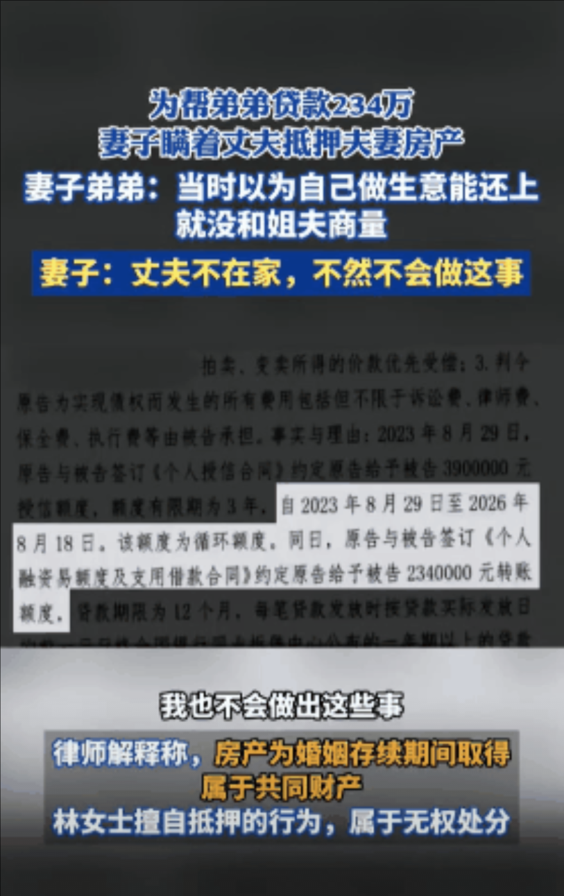 可张先生平时对钱管得很严,林女士如果跟他商量,到时候肯定是不会同意的。于是林女士趁丈夫不在家时,偷偷拿着房产证和弟弟去银行办了抵押贷款,然后将234万元全转给了弟弟。