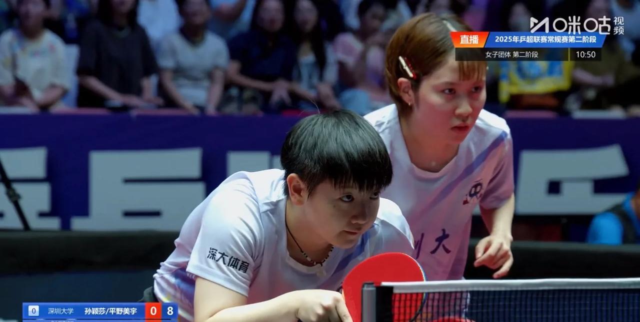 没想到深大今天女双是孙颖莎和平野美宇。 就说今天一热身的时候,莎莎和平野一直在唠嗑,原来是俩人要双打,昨天晚上莎莎才到的厦门,就今天赛前两个人沟通配了一下,就上场打比赛了。刚开始看到平野美宇和覃予萱一起练女双,还以为她俩上呢,她俩跑位的时候还是转圈圈,原来是覃予萱模仿莎莎和平野美宇配女双。局间的时候,平野美宇看着莎莎一直在点头,感觉平野和莎莎配女双时压力有点大,不过看到在打比赛的过程中,平野美宇丢分时莎莎都会及时跟平野说没关系。 平野应该可以听得懂中文,上场前俩人肯定沟通了手势。第一局是对手赢了,然后孙颖莎/平野美宇是连扳了2局,都是以11-8赢下比赛。看到平野美宇的教练张成也在现场,他应该会用日语跟平野沟通,虽然莎莎和平野是第一次配女双,看起来还不错,平野美宇执行能力也强。 到了第四局比赛,孙颖莎/平野美宇是3:1领先,对手把比分追平并反超了,对方的比分是6:3领先,双右打女双肯定在跑位上不如一左一右,现场四张球台同时进行比赛,确实有些吵,运动员们都需要专注自己的比赛,看到莎莎还和平野说悄悄话了,平野捡球也特别积极,跑的比莎莎快,莎莎和平野把比分追到了8:9,对方叫了暂停,暂停回来成都高新俱乐部的又扳回一局,两对的女双比分来到了2-2。今天的比赛都打的很精彩,要打决胜局了,深大加油!