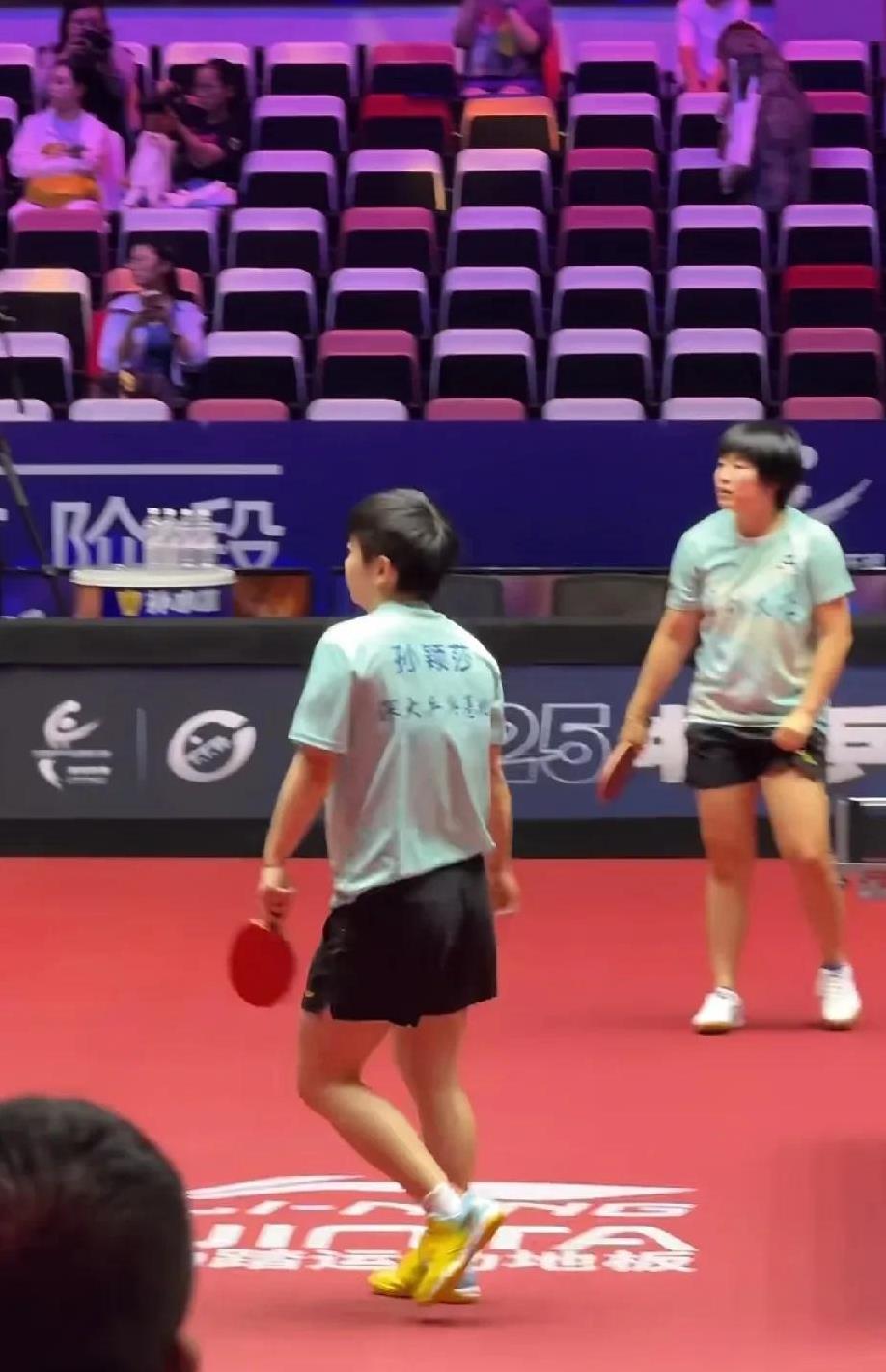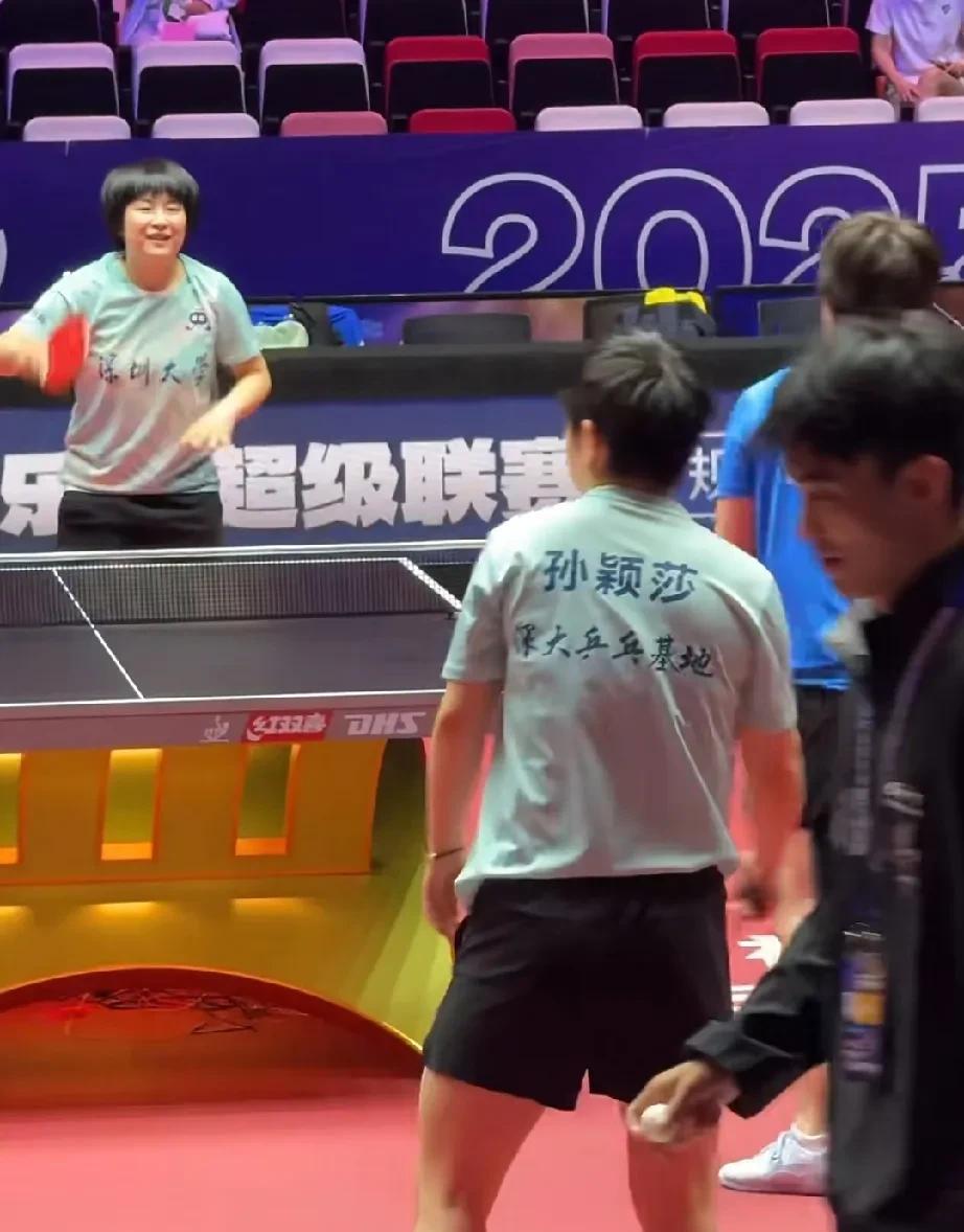 莎莎上训!今天10点30分,乒超第二阶段正式开赛,深圳大学对阵成都高新若水居! 深圳大学正在训练场里面赛前热身,可以看到莎莎跟平野,小蘑菇,小曼姐在对练! 莎莎是昨天才到厦门,平野小蘑菇小曼姐提前了几天才到达厦门。昨天莎莎到厦门的时候被挤得不成样了,真的非常反感那些在机场上围堵追私的人! 今天的首场首局是莎莎搭档平野双打,小蘑菇是一单,蒯曼今天没有出场,莎莎搭档平野,这是新组合哦,十分期待哈!! 深圳幼儿园,加油[加油][加油]