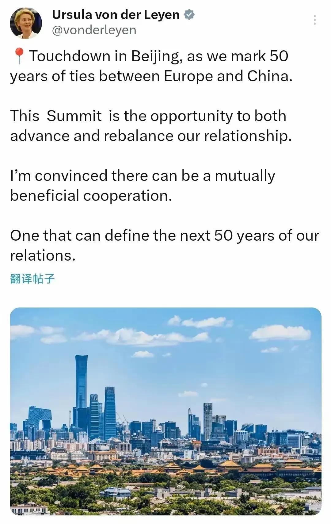 冯德莱恩北京之行后会改变骨子里的反华吗? 答案显然是否定的。此次冯德莱恩访华是她工作必须要完成的一部分。经中欧双方商定,欧盟主席冯德莱恩和欧洲理事会主席科斯塔来华访问一天。恰逢今年是中欧建交50周年,冯德莱恩为了稀土,为了关税,必须过来。她来华之前曾大言不惭叫嚣中国不给稀土,决不访华,可最终还是怂了。来了就来了,咱们对其并没有过高的期望。中欧想要双赢,就必须相向而行,多做有利于中欧关系的事,而不是像冯德莱恩这种对美马首是瞻的政客能建立好中欧关系。 她在社交媒体上发出的显然是一种作秀。其实,大家都知道她是个裸官,是美国安插在欧盟里的棋子,她的作用也不能太高看。只要她不离开欧盟主席这个位置,中欧关系很难好到哪里去。