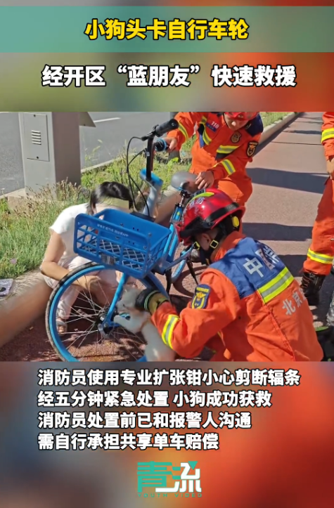 “意外还是发生了!”7月21日,北京,一女子遛狗时不牵绳,结果,小狗的脑袋卡进共享单车的车轮中,小狗受惊后剧烈挣扎,车轮辐条都变形了却还是挣脱不开!消防员救援前告知女子,要救狗的话只能破坏车轮,但是需要她自行承担赔偿。网友:建议遇到这种情况应适当收费!