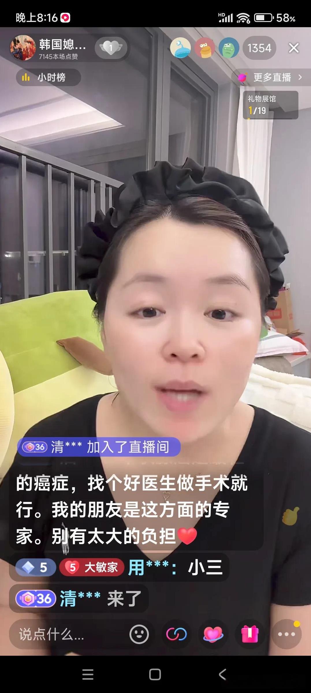大敏昨晚在杭州直播,有人留言,你婆婆动手术,你公公管吗?不管 婆婆说了,这病就是被老头气的,前几年老是打官司离婚离婚上法庭。后来又找了个小三儿,婆婆能不生气吗?这病就是气出来的情绪引起的。 大敏2号就回韩国,因为3号婆婆要动手术了。 今天婆婆还来深圳进衣服呢,生病了大敏说我婆婆就是个女强人呀。 今年大敏说净事啊,就是有点破财的年呀。老爸生病,婆婆又得癌了,能不让人操心? 人生就是有起起落落,没有人一帆风顺的。 幸亏大敏性格好,没心没肺的,整天哈哈哈。