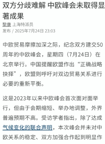 新加坡联合早报昨晚(7月24日晚)发表评论称:“双方分歧难解,中欧峰会未取得显著成果。中欧贸易摩擦加深之际,纪念双方建交50周年的中欧峰会,7月24日在北京举行。中国提醒欧盟作出‘正确战略抉择’,欧盟则呼吁对双边贸易关系进行必要的重新平衡。受访学者指出,除了达成气候变化的联合声明,本次峰会并未对中欧关系的稳定、双方加强合作起到明显作用。”