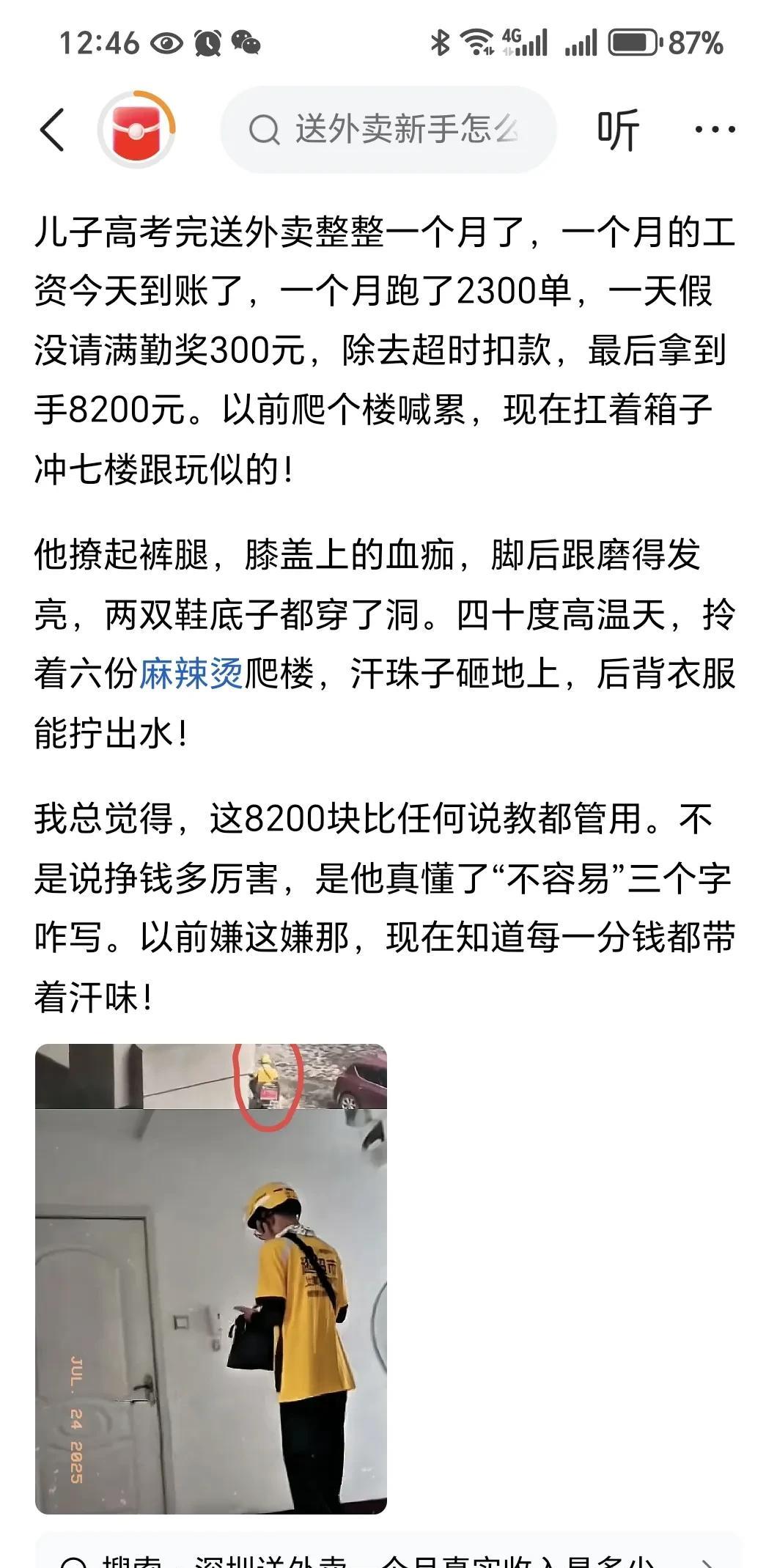 真心佩服这样的家长!儿子高考完去体验送外卖,一个月赚8000多!赚的挺多,生活很累,人生不易,让孩子早点感悟绝对是好事! 普通人的每一分钱都来之不易,让孩子知道每一分钱的重要性,让孩子知道社会的艰辛和活着的不易! 要是我的孩子,能有这孩子的一半懂事,我就满足了!当然2没法比,因为我这样的家长和人家的家长也是没法比! 关注我,比虚伪更真实!感谢人生,有你还有我!