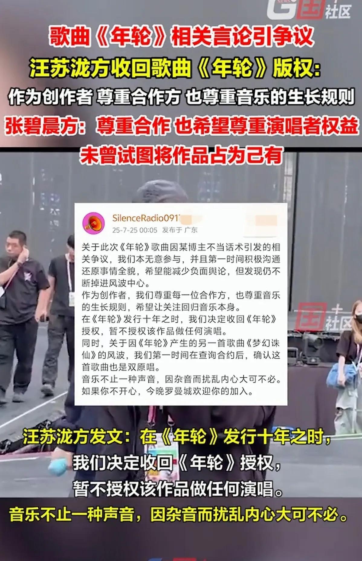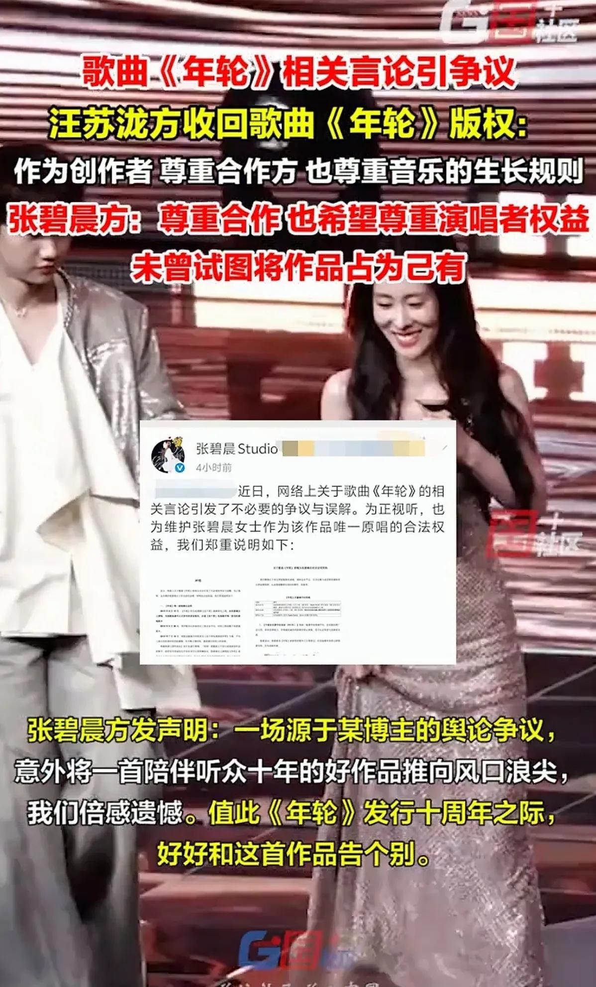 张碧晨被工作室的回应坑惨了,这是情商无下限。 一个不敢以真面目示人的网红挑拨了一下,无知无畏。 张碧晨工作室一方完全可以大度回复,专注于音乐。 结果工作室像是抽风了,直接抢夺唯一原唱标签,把汪苏泷这个原创彻底丢一边。 这首《年轮》能够传唱10年,原创音乐人汪苏泷功不可没。 而且汪苏泷也是一位知名歌手,仅仅晚张碧晨十几天唱这首歌,就让张碧晨成了唯一原唱。 不知情的还以为这首歌是张碧晨原创的,汪苏泷一方当然怒了。 直接暂停授权别人演唱会唱这首歌,目前还不知道张碧晨能不能继续唱,这涉及到两方合同当时怎么签的。 张碧晨工作室的回应一下子让路人感觉张碧晨有些忘恩负义。 毕竟十年前,张碧晨因为这首歌名声大噪,起码有一半汪苏泷的功劳。