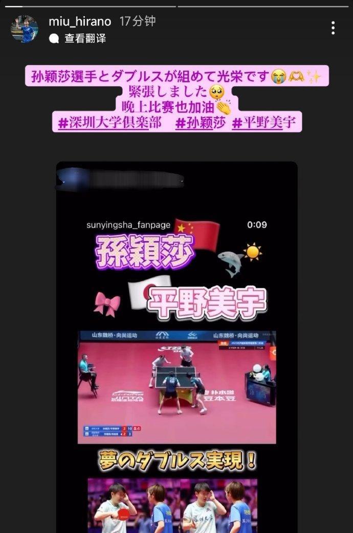 平野美宇连发两条和孙颖莎打女双的动态。 看得出来,平野美宇和孙颖莎打女双是既紧张又开心。在赛后采访平野美宇时,她用中文笑着说:“我今天跟孙颖莎选手一起双打太紧张,我赢了,太开心,谢谢”。采访结束后,平野回去后还找了几张她和莎一起的照片,发了两条动态,平野说能和孙颖莎选手搭档双打,她感到很荣幸,她也感觉很紧张,晚上的比赛继续加油。 确实大家都看出来今天打比赛的时候,第一局平野打的有点乱,确实有压力,小周老师解说的时候也说平野和世一打女双有点紧张,但是看得出来平野很开心。赢下比赛后,莎莎还暖心的拍一拍平野的肩膀,比赛的时候也是一直给予平野鼓励,两个人也一直沟通。李武军问莎莎怎么跟平野沟通,莎莎说用中文,平野会一点中文,她能听得懂。 平野来深大打乒超后,是真的开心了,还能和莎莎一起打女双。昨天晚上莎莎才到的厦门,应该也是教练组临时定的让她俩打女双,莎莎说俩人没有配过,也没有练,拿着球拍就上场打了,能赢下比赛还是很开心,深大幼儿园的小朋友们继续加油吧!