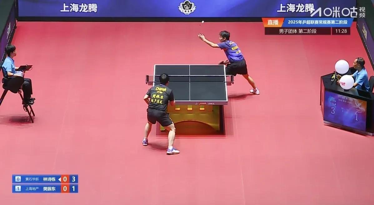还是不行啊!林诗栋被樊振东横扫! 中国乒超联赛第二阶段比赛今天开始进行。在上海地产对黄石华新的比赛中,樊振东迎战林诗栋。 第一阶段的比赛,林诗栋曾经输给樊振东。这次,林诗栋依然在关键时刻把握不住,以0:3(10:12、10:12、9:11)被樊振东横扫,黄石华新丢掉了第二盘。 黄石华新大比分0:2落后上海地产,形势严峻。