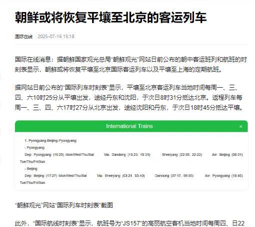 朝鲜做出了一个“重大决定”,和中国有关。金正恩一出手就是大动静,前几天说要派3万人去支援俄罗斯,这两天又宣布即将恢复平壤到北京的客运列车。 先说说恢复火车这事儿。这趟车自从 2020 年疫情后就停了,现在重新开,可不光是通个车那么简单。 从挣钱过日子来讲,中国一直是朝鲜主要的生意伙伴,朝鲜缺的盖房子用的材料、干活儿的机器,还有老百姓日常用的东西,好多都是从中国弄来的。 以前靠卡车拉,又慢又费钱,火车一通,从丹东到平壤运东西快多了,对朝鲜盖房子、修公路这些工程帮助可大了。 而且人来往方便了,做买卖的、懂技术的交流起来更顺溜,说不定能搞出不少合作,让朝鲜的日子过得活泛点。 从脸面上来讲,这些年美国总说朝鲜的坏话,让朝鲜在外面没多少朋友。现在跟中国恢复通车,等于告诉大伙儿,朝鲜不是关起门自己过,愿意跟好朋友来往。 这时候中美正较着劲呢,这么做既让中国看到朝鲜想好好合作的意思,又给外面递了个好信号,这招确实挺高。 说完火车的事儿,再说说派 3 万人去帮俄罗斯。俄乌打了这么久,俄罗斯那边人手不够用了,朝鲜这时候伸手帮忙,时机掐得挺准。 派去的 3 万人,听说都是能打仗的精兵和会技术的工人。 这些人到了俄罗斯,不光能帮着凑人手,还能在真刀真枪的战场上学学现在打仗的门道,对朝鲜军队变强太有用了。 这里面还有互相搭把手的意思。朝鲜这些年被美国卡得挺狠,油啊、粮食啊都不够用。俄罗斯虽说自己也不宽裕,但油、粮食这些东西还有不少。 朝鲜帮俄罗斯解决人手问题,俄罗斯回点油、粮食,对朝鲜来说太关键了。 之前朝鲜给俄罗斯送过炮弹、导弹,俄罗斯就给了朝鲜造无人机的技术和防空用的家伙,这种互相帮衬,对朝鲜军队发展老重要了。 其实朝鲜这么干,也是想让自己活得自在点。美国老找朝鲜的麻烦,朝鲜得找朋友撑撑腰。俄罗斯是能打硬仗的国家,跟它处好关系,安全上能有保障。 中国是经济上有实力的国家,跟中国走近点,钱和物资上能有支持。在大国中间找个平衡,才能在这复杂的世道里站稳脚跟。 说真的,朝鲜这两个决定,看着不搭边,其实都是为自己打算的精明选择。 既顾着眼前的实在好处,又想着以后的日子,把小国家过日子的法子玩得挺明白。