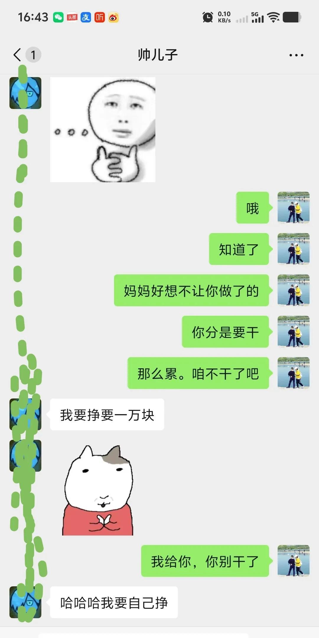 我儿子,在我们公司打暑假工,一天挣那150块钱,实在太难了! 今天下午,儿子去烘干粉碎产品回来了。太让人心疼了,我差点没认出来。 儿子浑身都湿透了,全身上下都是脏兮兮的。 我让儿子赶紧去洗个澡,换上干净衣服。儿子不愿意,马上又去他原来提取的岗位,要求领导安排工作了。 儿子来厂子干这十几天,脚上被烫了个水泡,还被蚂蚁咬了无数口。腿上、身上,到处都是挠的伤疤。 作为母亲,我实在不忍心儿子在车间受苦受累了。 我给儿子发去信息,“妈妈好想让你不做了的,你分是要干,那么累,咱不干了吧?” 儿子发来信息:“我要挣一万块。” 我说,“我给你,你别干了。” 儿子给我发来信息:“哈哈哈我要自己挣。” 没办法,我只好去找老公商量,让他劝劝儿子别再做了。 哪里想到,老公给我发来信息,“我不是全身都是湿的,干了又湿,湿了又干滴。” 突然,我特别难过。原来我从来没有考虑过老公,他也是一直在车间如此辛苦的啊! 车间打工人受的苦和累,哪是坐在办公室吹着空调的人能体会到的呢?
