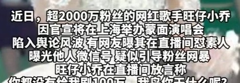 最近关于网红旺仔小乔的相关事件还在持续发酵,起因是因为旺仔小乔要开一场蒙面演唱会