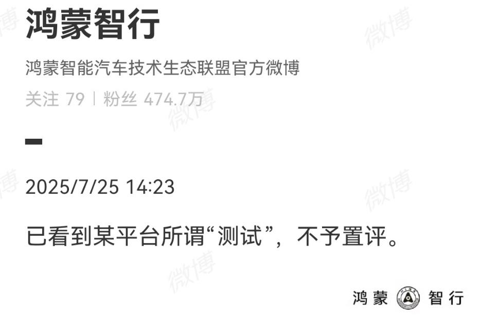 鸿蒙智行对于某智驾测试表示,已看到某平台所谓的“测试”,不予置评。