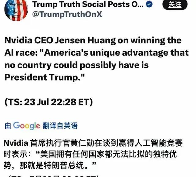 老小孩。特朗普23日转发了英伟达CEO黄仁勋在谈到赢得人工智能竞赛时说的话:“美