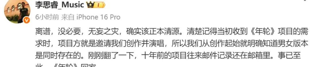 张碧晨这下玩大了,以后都不能唱《年轮》了,何必呢? 回顾一下《年轮》原唱之争的始末 事情从一个网红开始,追溯到2021年的评论,她说《年轮》的唯一原唱是张碧晨,此番言论经过发酵,引发粉丝之间的争议。 作为词曲作者,汪苏泷方发声明表示歌曲是双原唱,经过沟通仍旧无法阻止舆论发酵,所以决定收回歌曲版权,意味着张碧晨以后都不能再唱。 紧接着,张碧晨方不甘示弱,晒出很多所谓证据来证明自己是唯一原唱。 最后,汪苏泷经纪公司大象音乐总经理李思睿发文称,当初收到《年轮》项目需求时,项目方就是邀请他们创作并演唱,从创作起始就明确知道男女版本同时存在,十年前的项目往来邮件记录还在邮箱里。 我不太明白,张碧晨方面强调自己唯一原唱的意义是什么?难道谁唱火这首歌就是谁的吗?双原唱就丢人了?非要和汪苏泷方对撕,既不体面又很冷血。除了这首歌,还真不知道张碧晨有啥出名的原创作品。