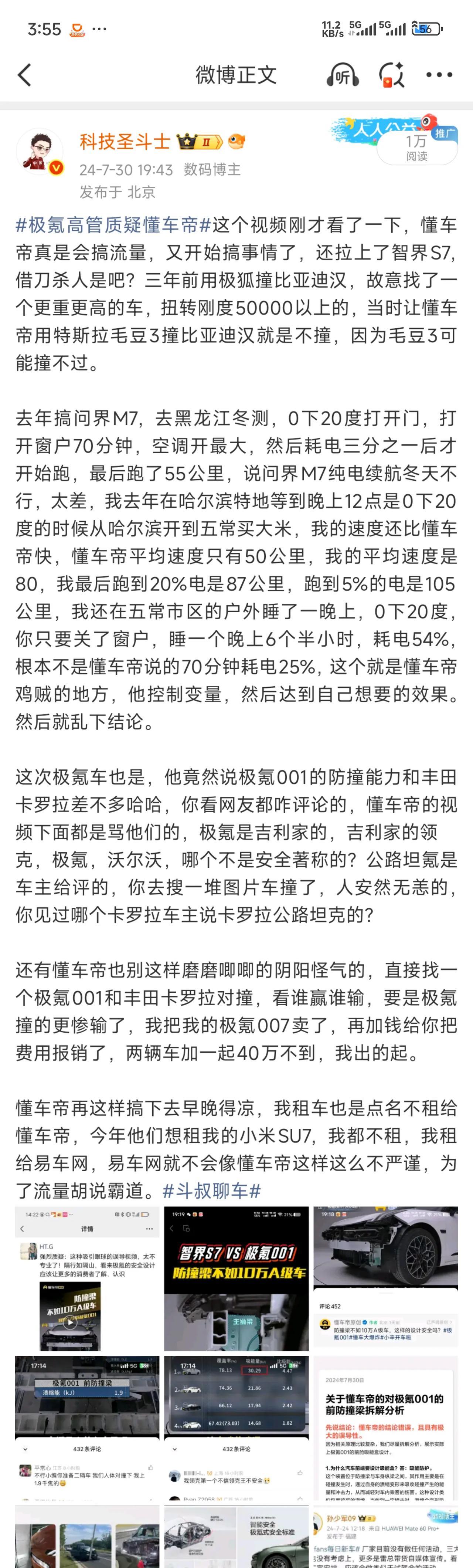 #鸿蒙智行不予置评# 这个算华为硬刚懂车帝了,之前懂车帝冬测和测AEB的时候也刚过,好像一直都不太对付,两个都有巨大流量,谁也不怕谁。懂车帝的测试,我一直都是笑着看的,从问界M5的AEB,后面问界M7的冬测续航,还有包括去年测极氪那个吸能碰撞的,竟然说和卡罗拉的差不多,我当时就说懂车帝找个卡罗拉和极氪001对撞,极氪输了两个车我都买了,我信赖极氪的安全,我真不信卡罗拉的安全。 看鸿蒙智行这个评论区,很多都是开过华为智驾的车主,都说好用,从用户口碑来说,华为智驾的确用的人最多,也是最好的,特斯拉fsd国内有几个人开通的?有几个用户口碑?一年跑了多少公里?有多少真实车主开通了FSD?我身边认识的朋友,除了自媒体,现实生活一个都没有,一个都没有,一个都没有。他们就是买了个特斯拉的车然后用免费的高速辅助驾驶,城区智驾要6.4万元太贵了,都舍不得开。 华为乾崑智驾不仅是鸿蒙智行,极狐,岚图,阿维塔,方程豹,东风,深蓝都有合作,去问问买这些车的车主们好用不好用就行了,用户的口碑是最实在的。目前国内智驾水平头部三家的就是华为小鹏理想,用户口碑都是不错的,我之前说了,能在第一电动网的智驾比赛拿个冠军再说吧,之前几十站比赛,大部分都是华为系的车,小鹏,理想拿冠军,特斯拉从没拿过。不服的特吹开着自己的车去比一场,免费报名的,是骡子是马遛一遛吧。